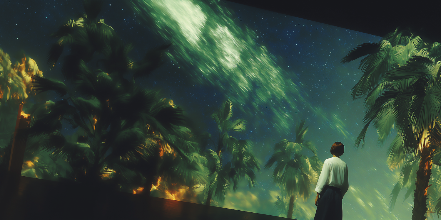A person stands under a starry sky with palm trees, gazing at the Milky Way's glow, creating a serene and contemplative scene.