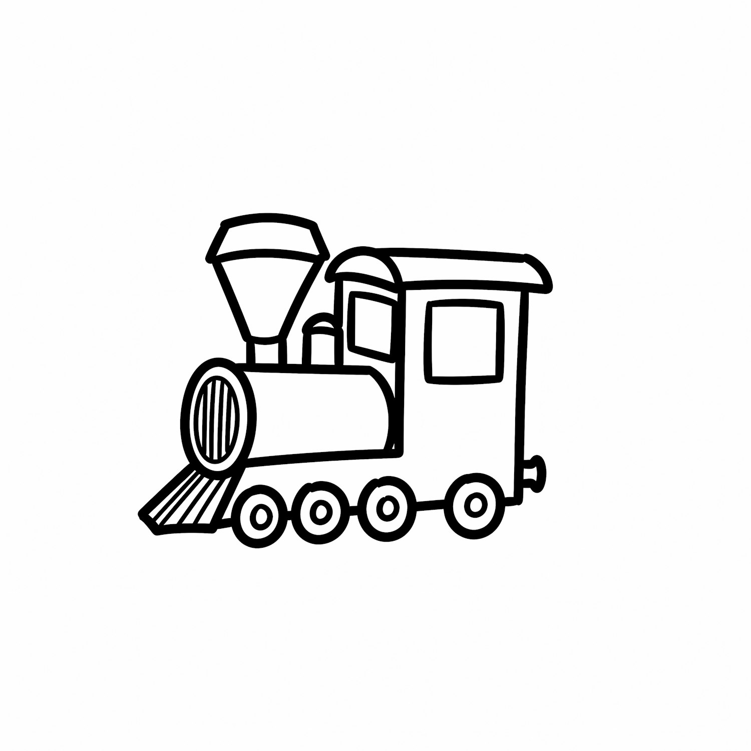 Minimalistic black-and-white line drawing of a classic steam locomotive with a chimney, boiler, and cabin.