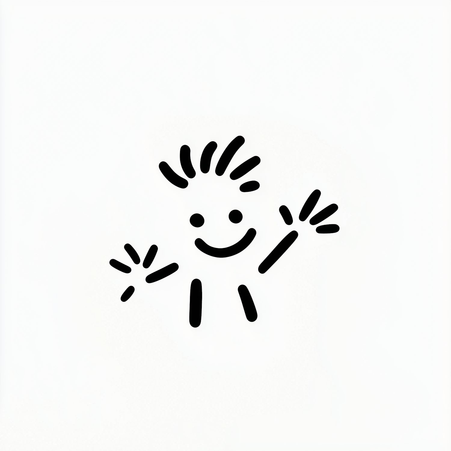 Minimalist stick figure illustration of a smiling character with spiky hair and raised arms, giving a cheerful and welcoming vibe.