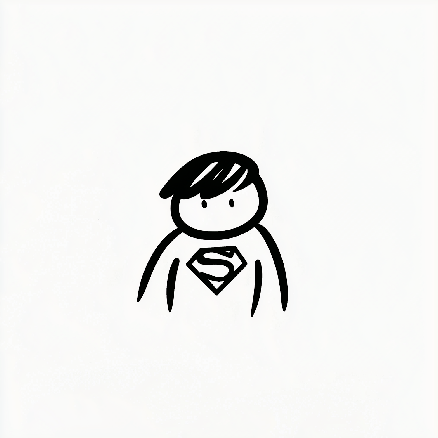 Minimalist stick figure illustration with Superman logo on chest, simple black-and-white design with playful cartoon style.
