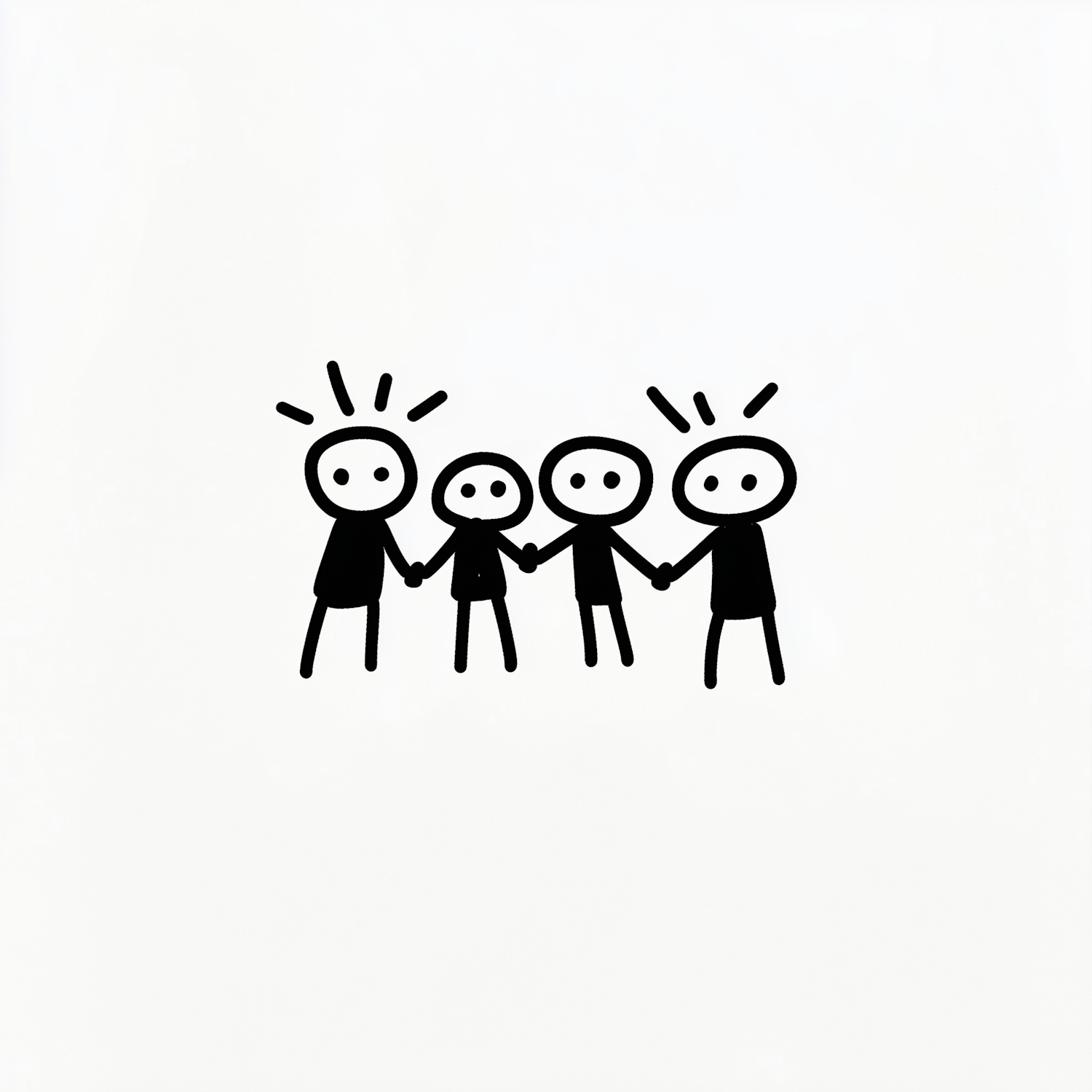 Minimalist stick figure illustration of four characters holding hands, radiating energy and unity on a clean white background.