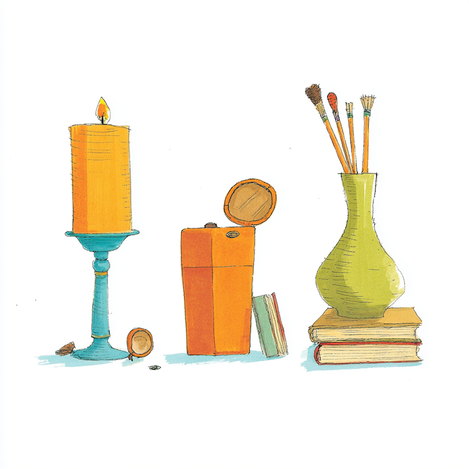 A charming still life illustration featuring a candle, a box, books, and a vase with paintbrushes, all in vibrant colors.