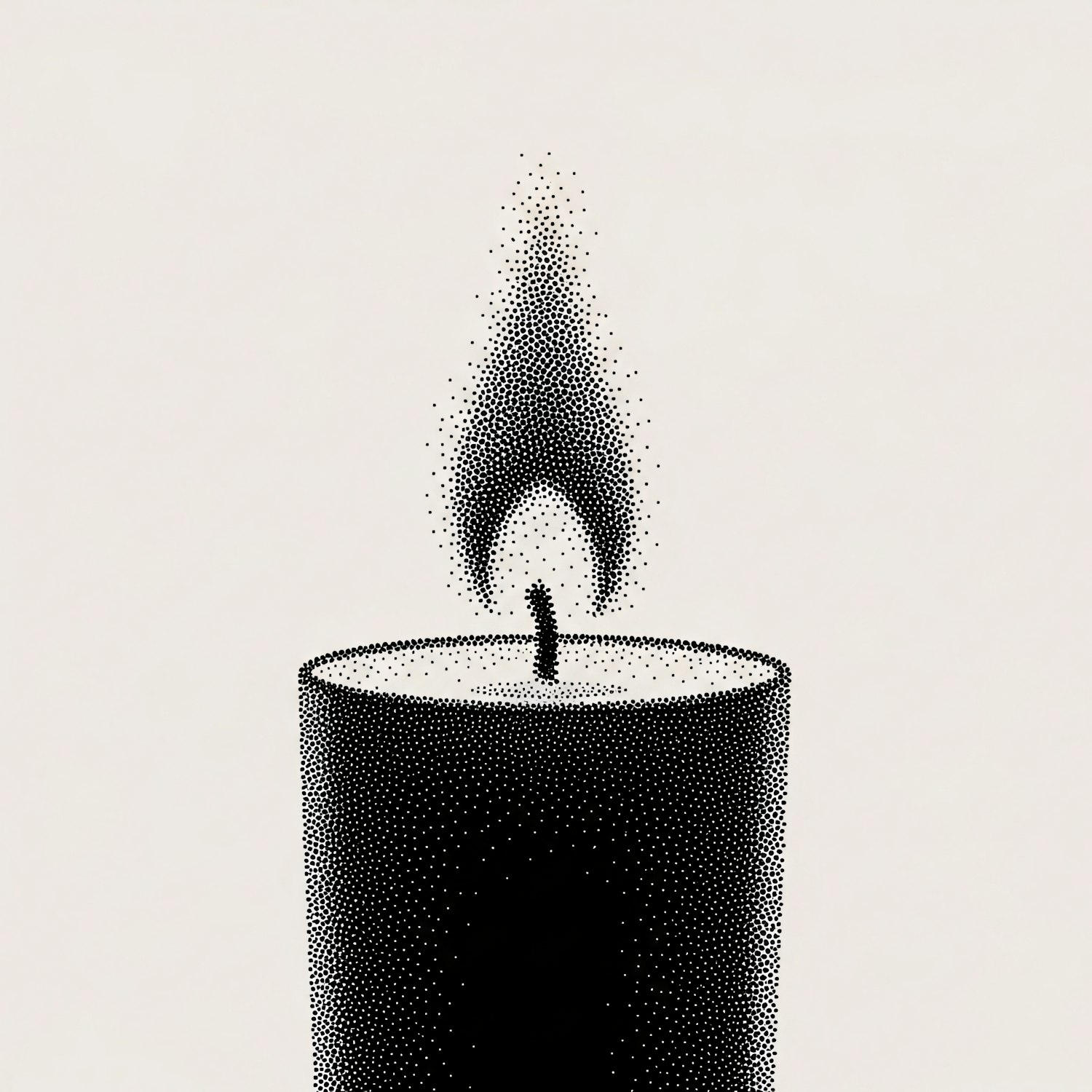 Minimalist stippled illustration of a candle with a flame, featuring a textured black-and-white design on a plain background.