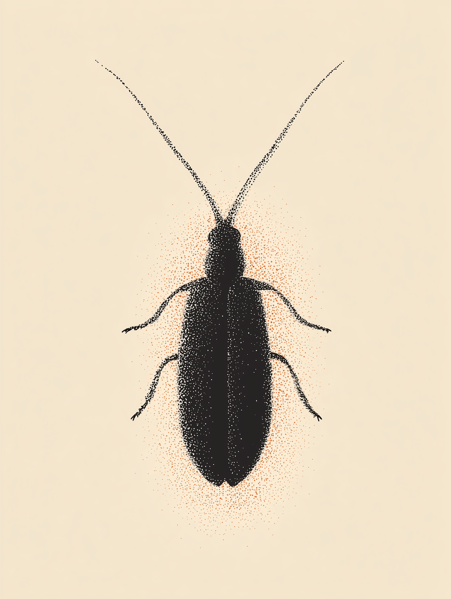 Stylized stippling illustration of a cockroach on a beige background, showcasing intricate dot work and minimalist design.