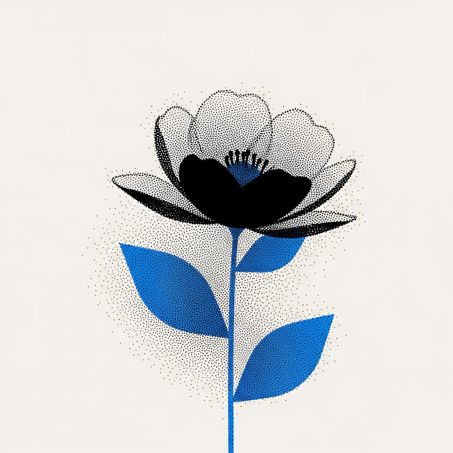 Stylized flower illustration with black and white petals and blue leaves, created using a stippling technique for a textured look.