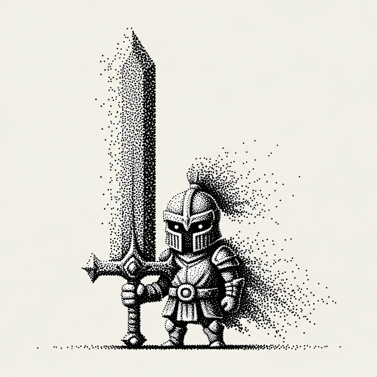 A stippled illustration of a knight in armor holding a large sword, with intricate dot patterns and a minimalistic background.