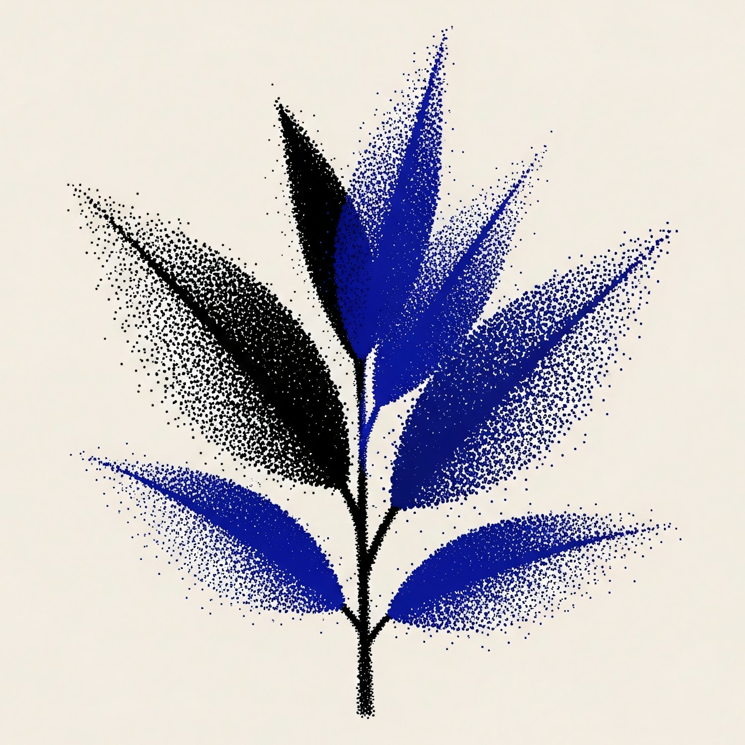 Stylized stippled plant illustration with blue and black leaves on a beige background, showcasing a minimalist and textured design.