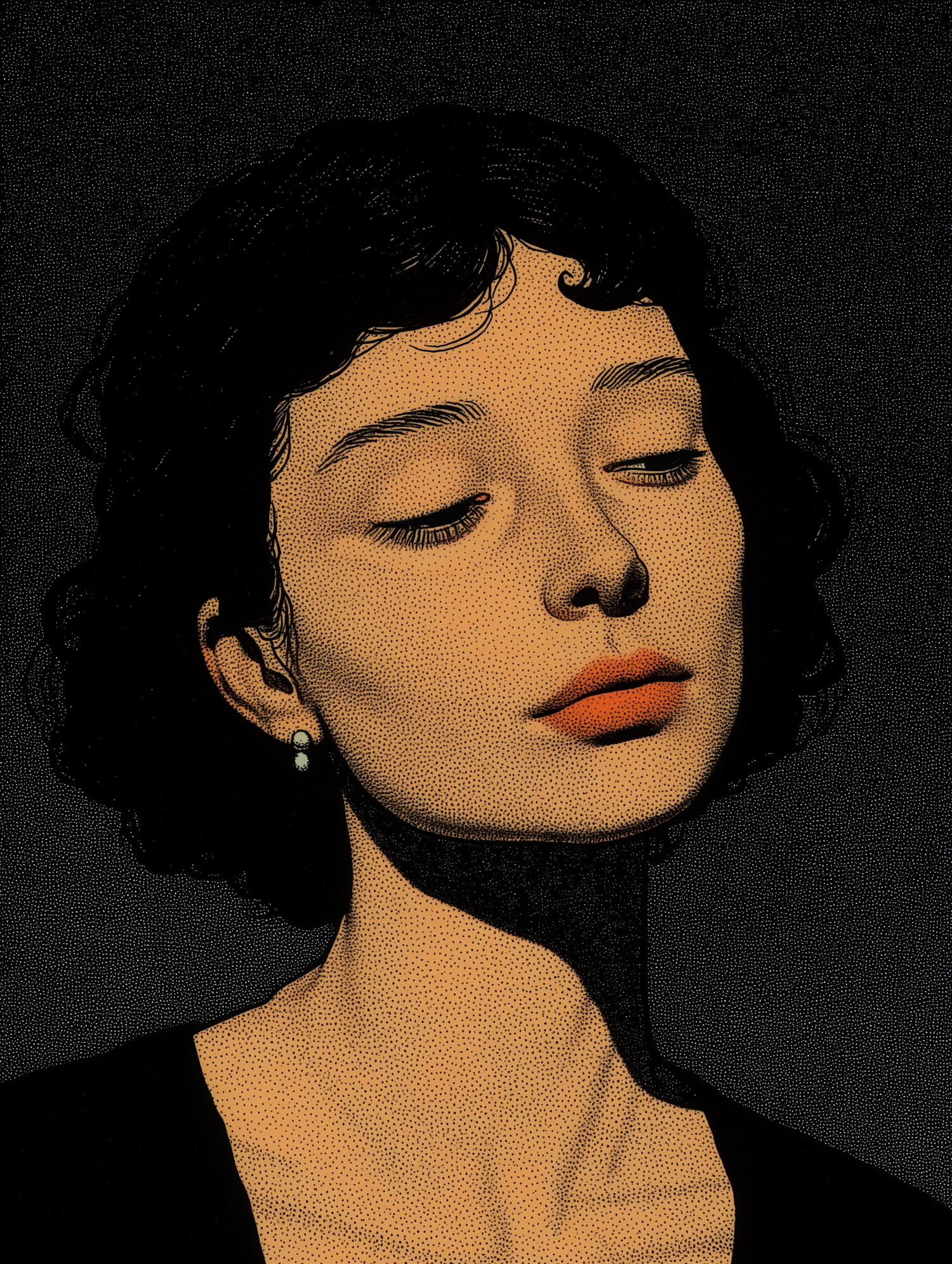 Stylized illustration of a woman with short black hair, closed eyes, and a pearl earring, created using a stippling technique.