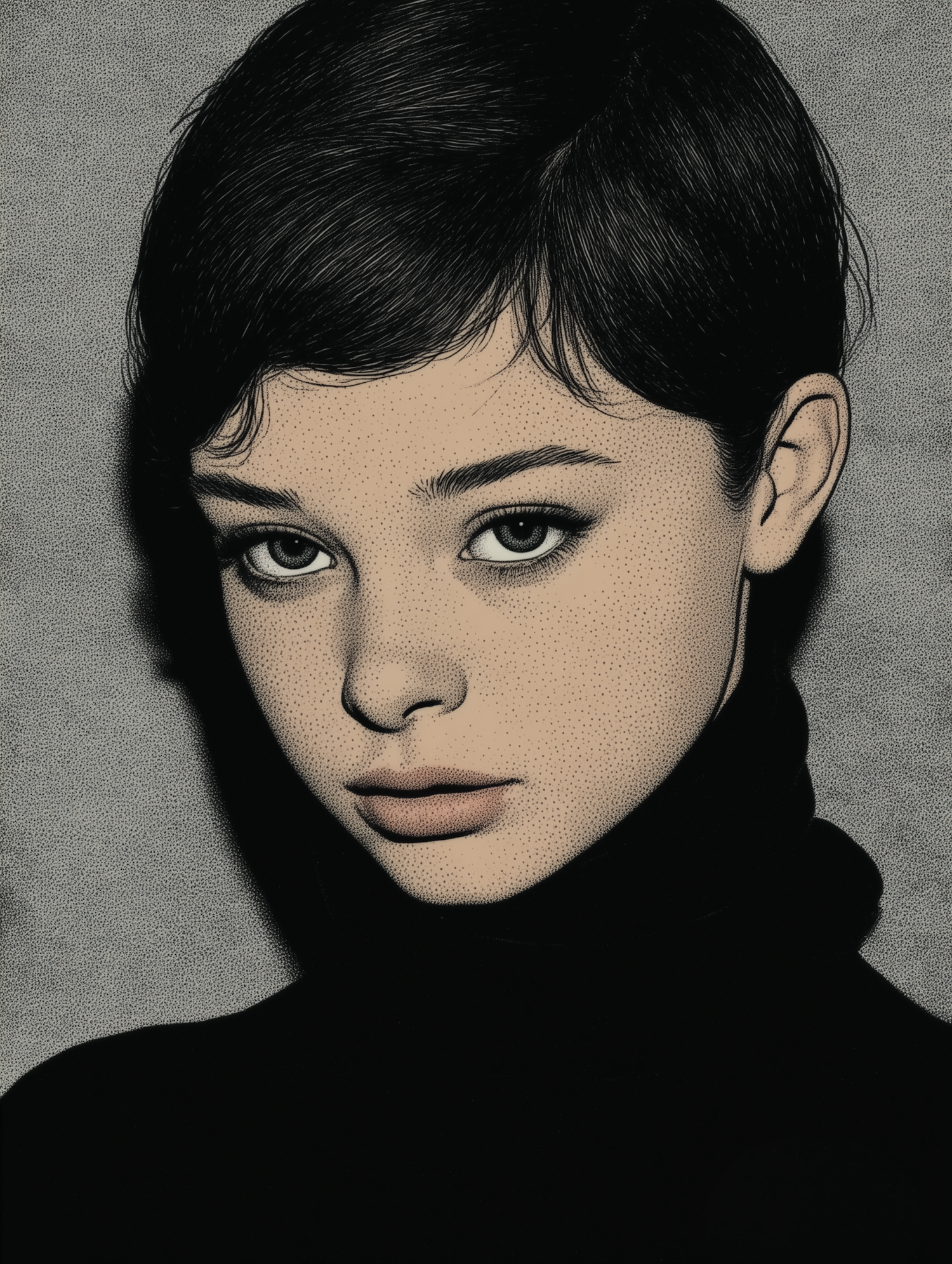 Stylized portrait of a young individual with short dark hair, rendered in a stippling technique, against a muted gray background.
