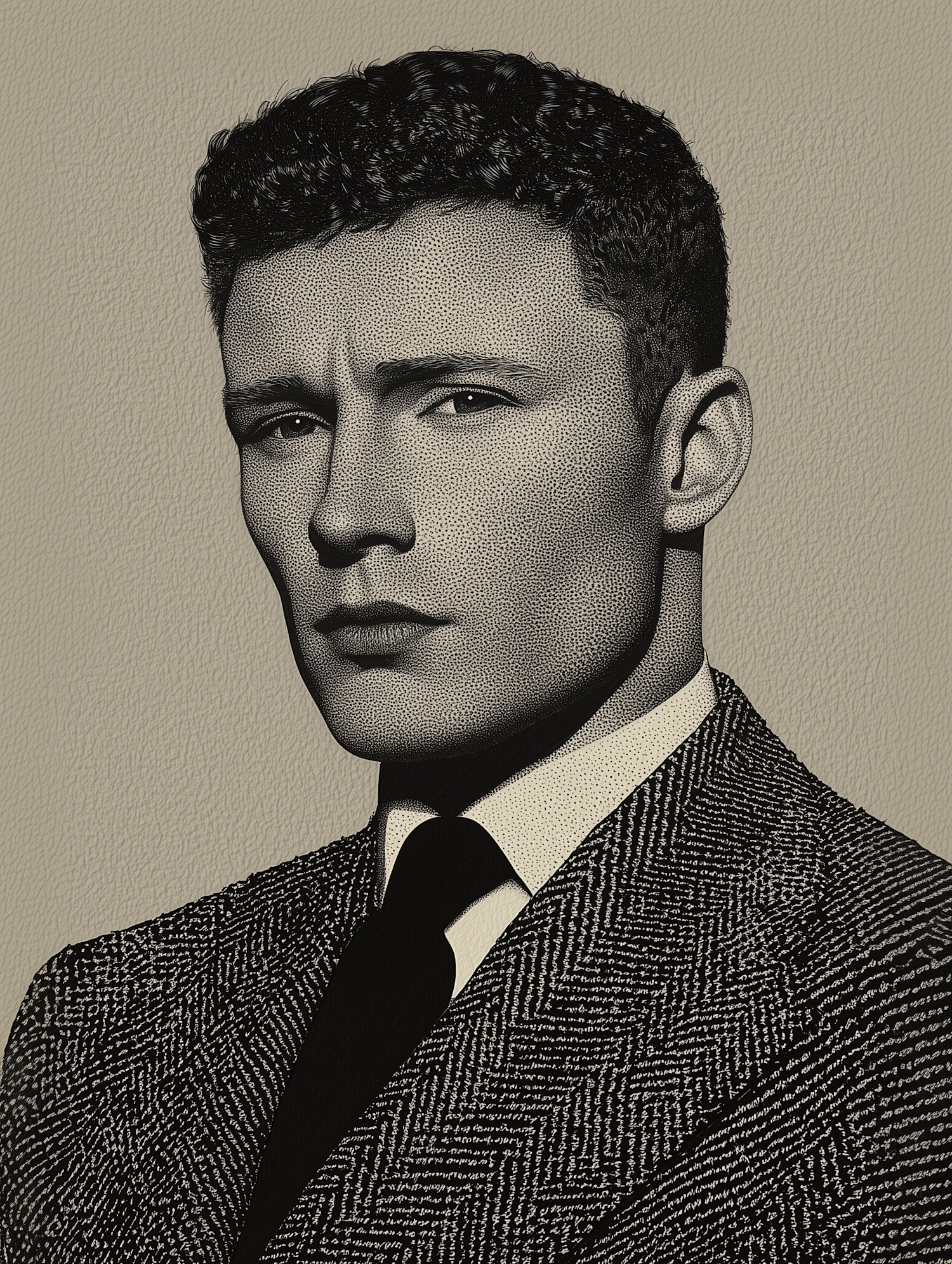 Vintage-style illustration of a man in a herringbone suit, featuring a stippling technique and a textured beige background.