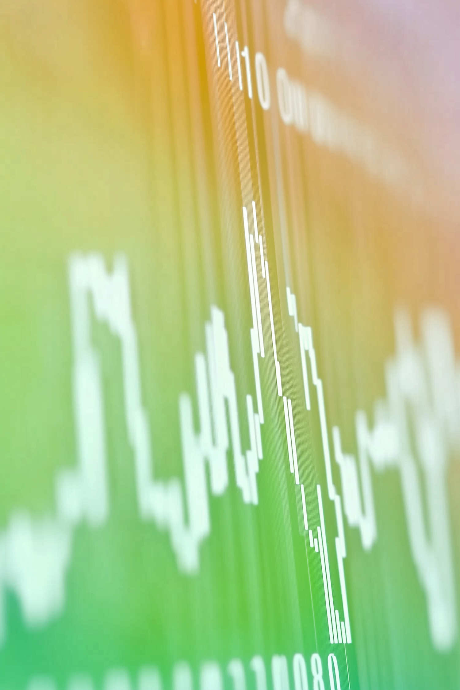 Abstract stock market chart with green-yellow gradient, white candlestick patterns, and fluctuating lines symbolizing market trends.