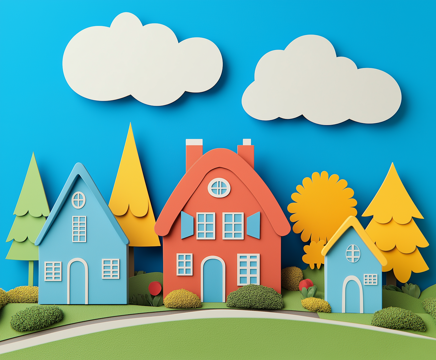 Colorful cartoon houses under a bright blue sky with fluffy clouds and stylized trees, creating a whimsical neighborhood scene.