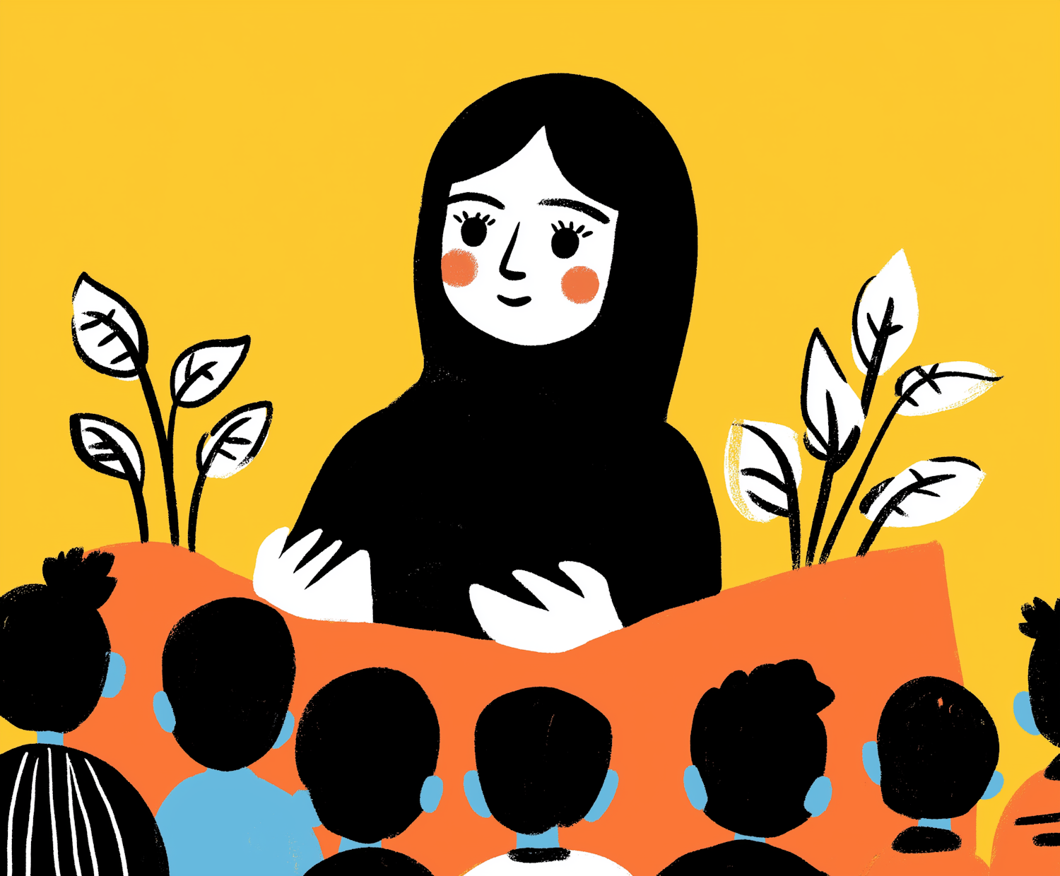 Illustration of a woman teaching children, with bold colors and abstract plant shapes, creating a warm and educational atmosphere.