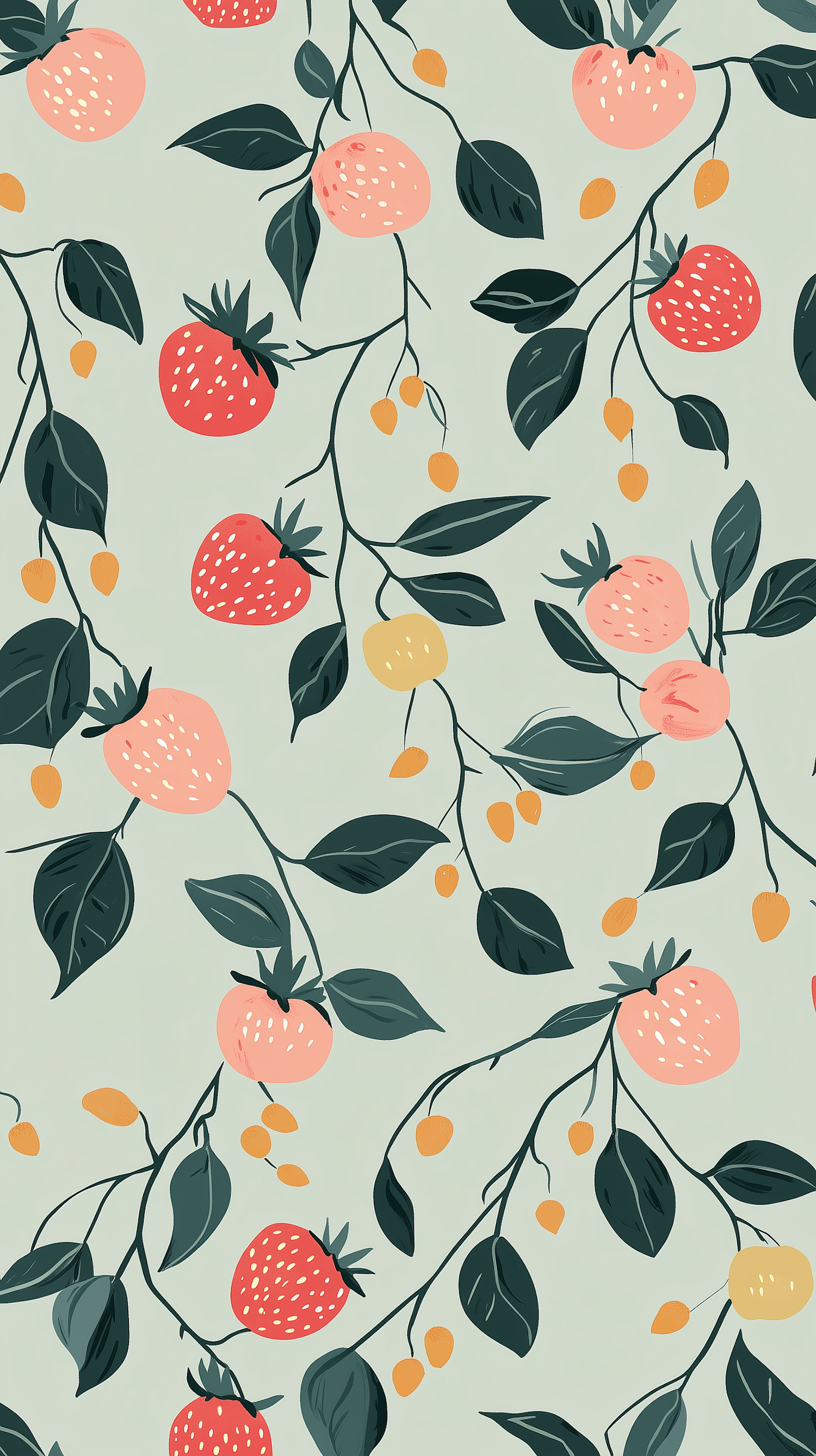 Seamless pattern of stylized strawberries and leaves on a light green background, featuring red, pink, and yellow-orange hues.