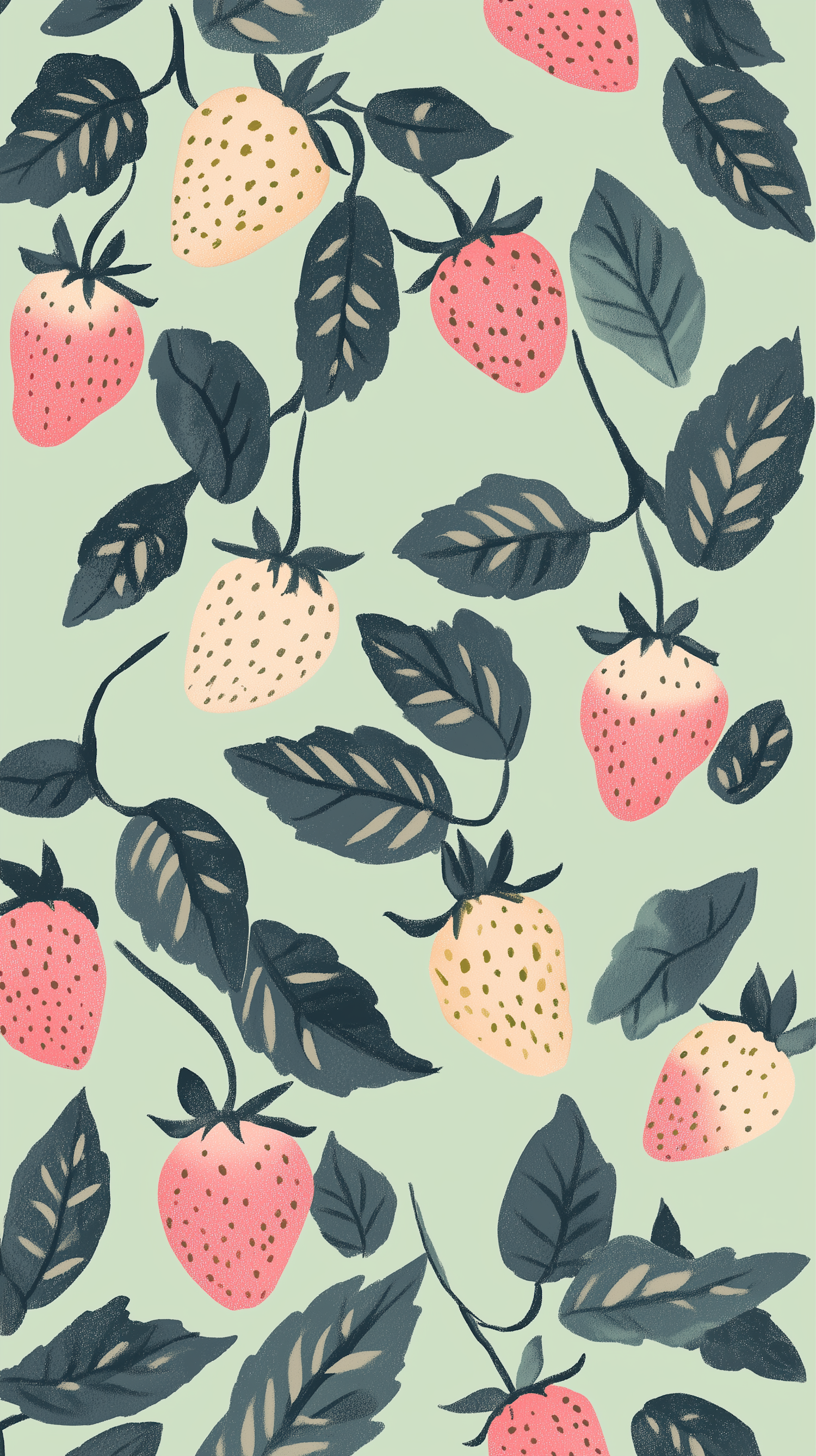 Whimsical strawberry and leaf illustration on a light green background, featuring pink and cream strawberries with dark green leaves.