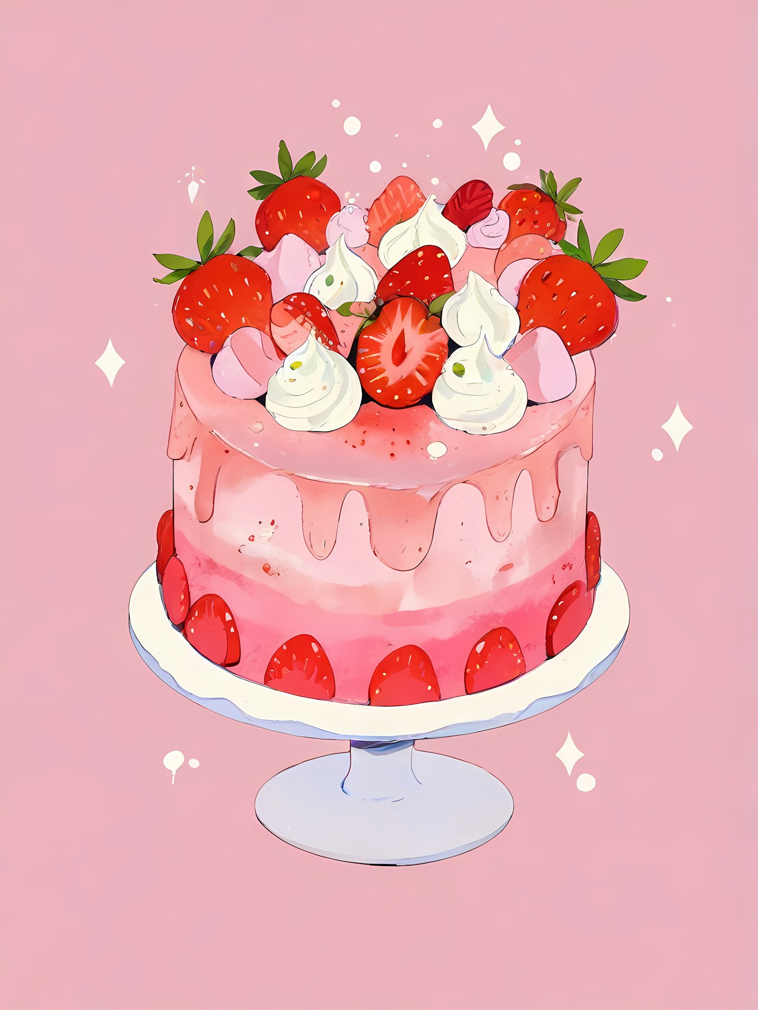 Whimsical pink cake illustration with strawberries and whipped cream on a white pedestal, set against a soft pink background.