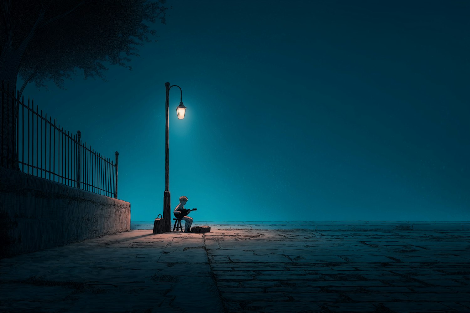 A lone street musician plays guitar under a glowing streetlamp on a quiet, cobblestone street at night. Peaceful and atmospheric.