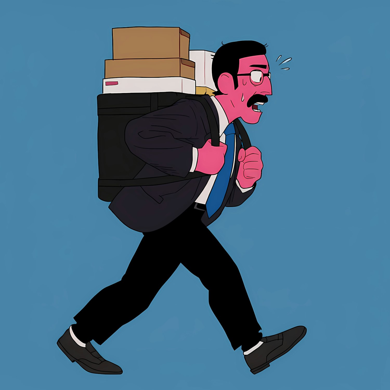Cartoon of a man in a suit carrying a heavy backpack of boxes, walking with effort against a blue background.