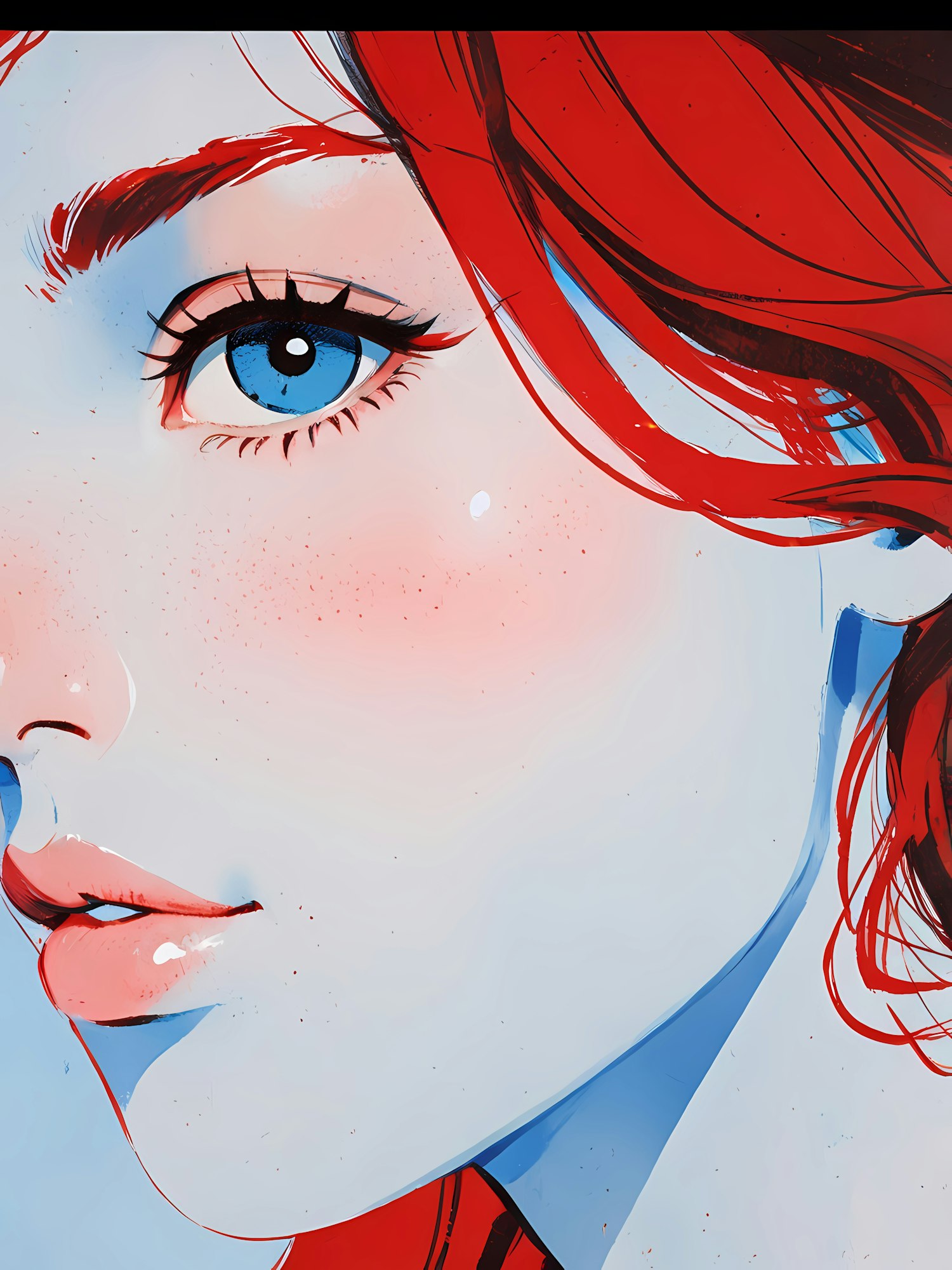 Vibrant illustration of a woman's face with red hair, blue eyes, and freckles, showcasing bold colors and dynamic lines.