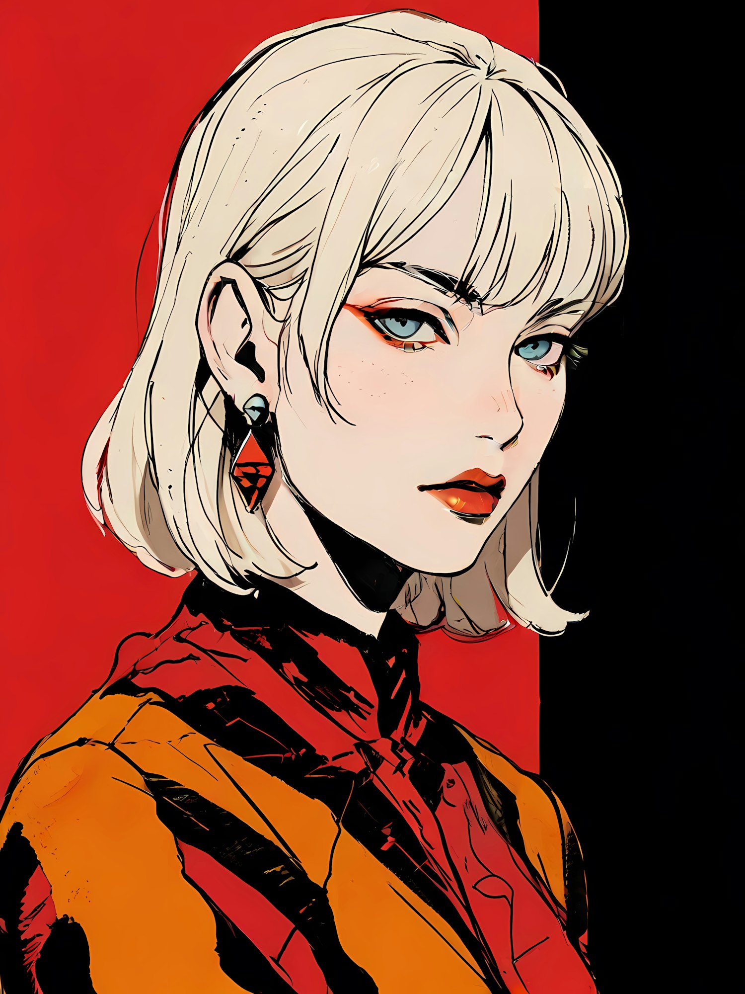 Stylish illustration of a woman with platinum blonde hair, blue eyes, and bold makeup against a red and black background.