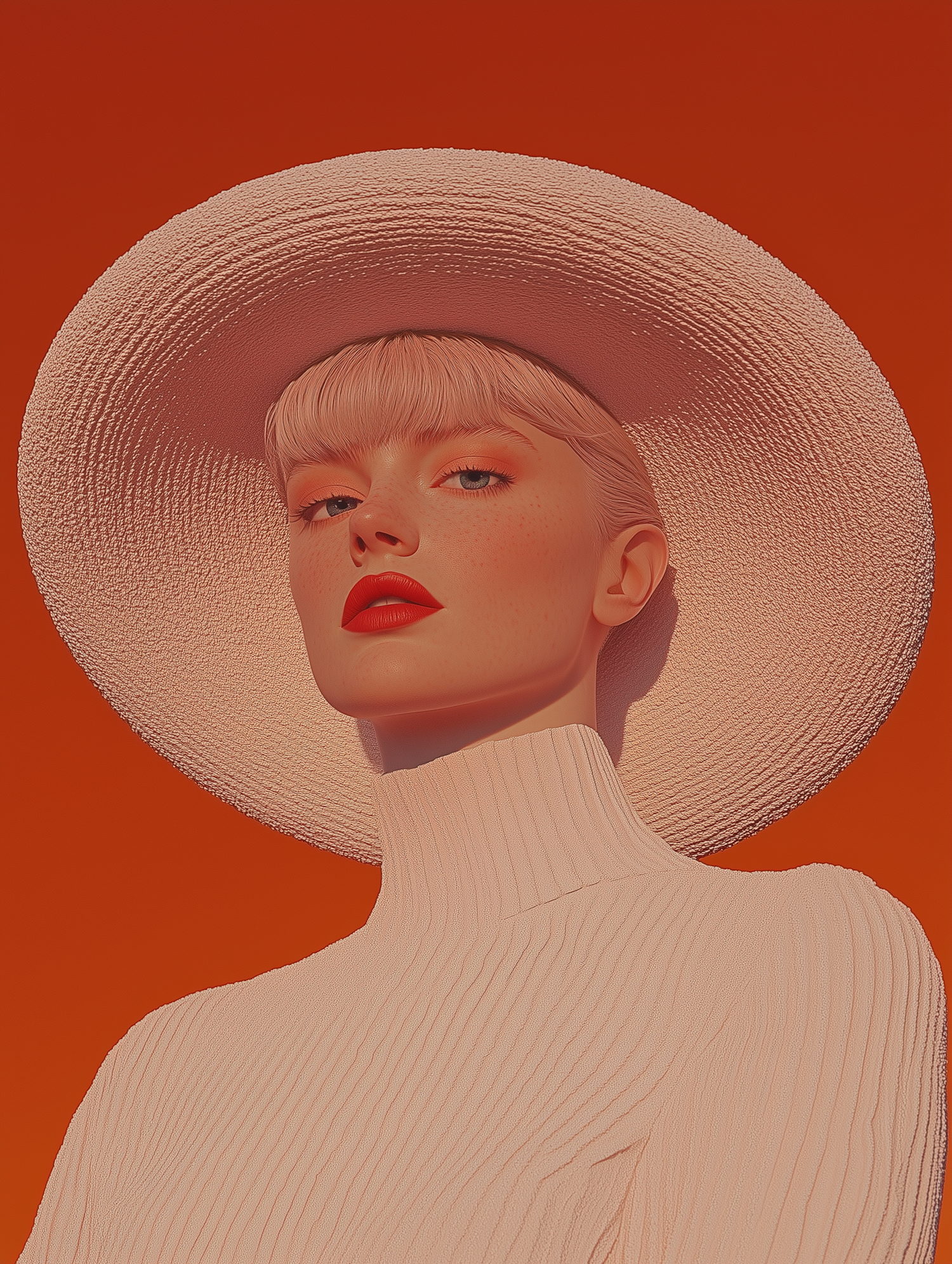 Elegant portrait of a woman in a textured hat and ribbed sweater against a bold orange background, exuding confidence and style.