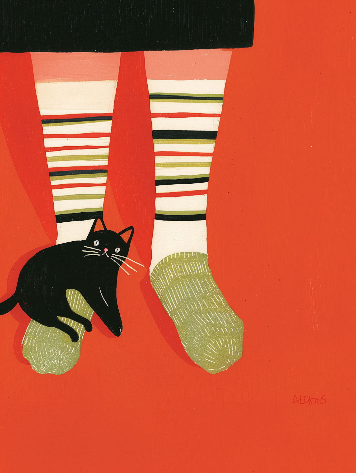 Playful illustration of striped socks, a black skirt, and a curious black cat on a bold orange background. Whimsical and colorful design.