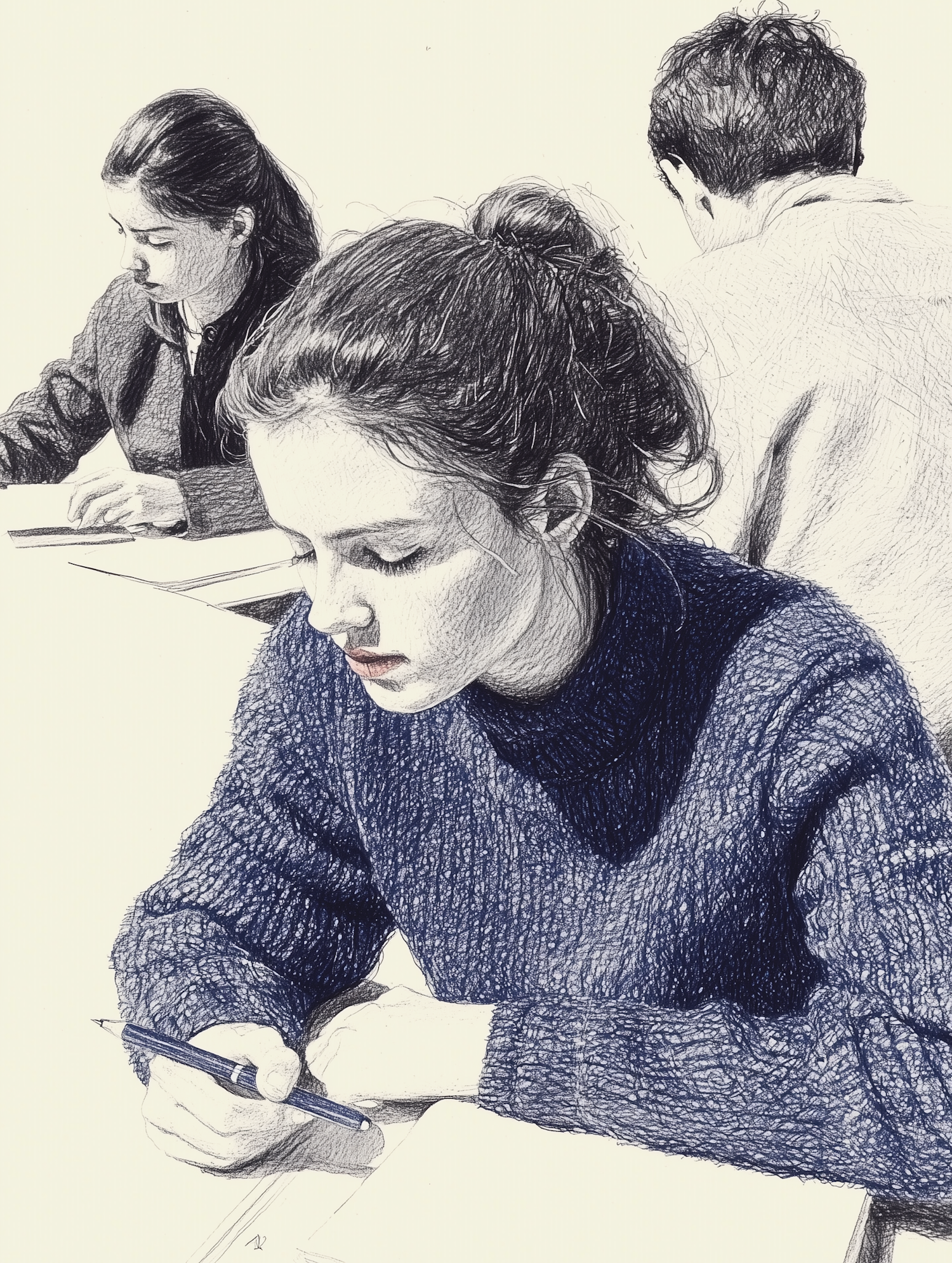 Illustration of focused students writing, featuring detailed textures and a calm, studious atmosphere.