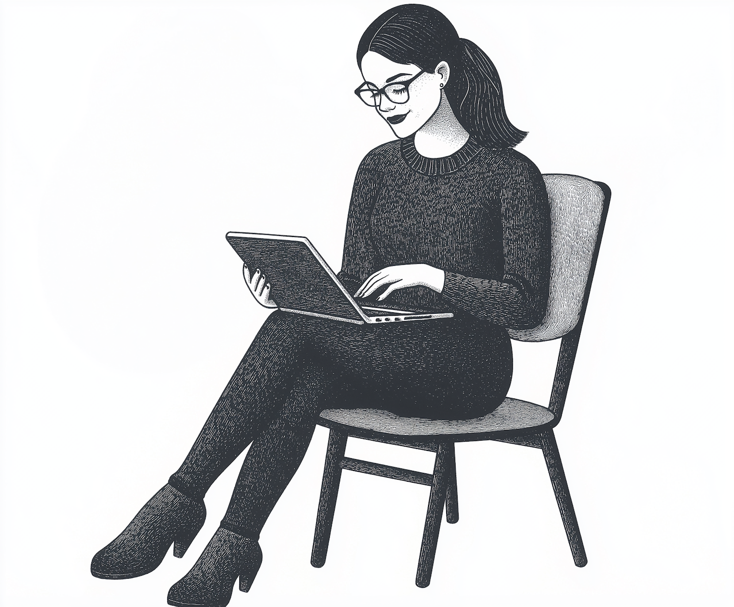 Black and white illustration of a woman with glasses working on a laptop, seated on a chair, exuding focus and concentration.