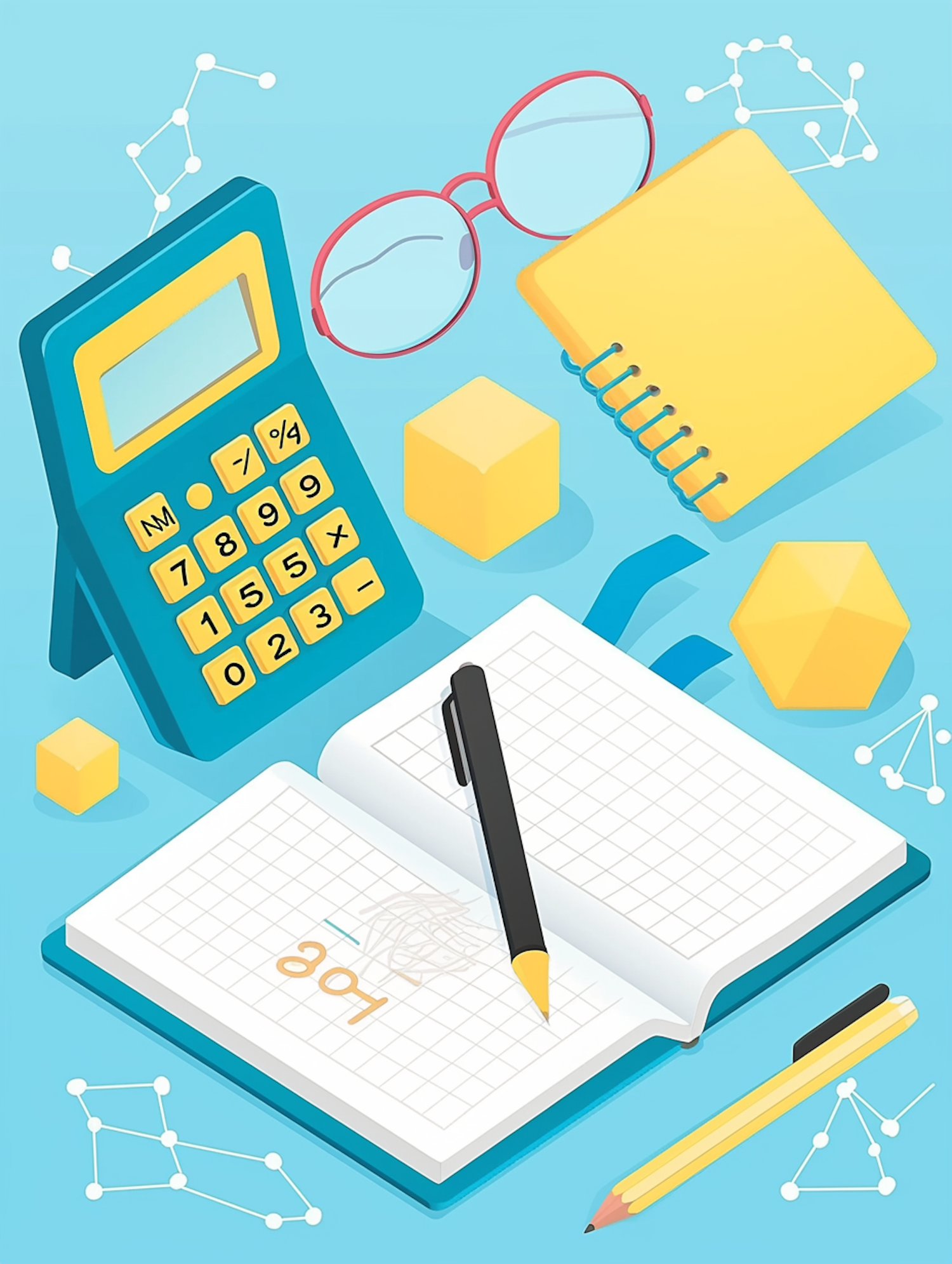 Bright illustration of study essentials: calculator, notebook, pen, and geometric shapes on a blue background with constellation designs.