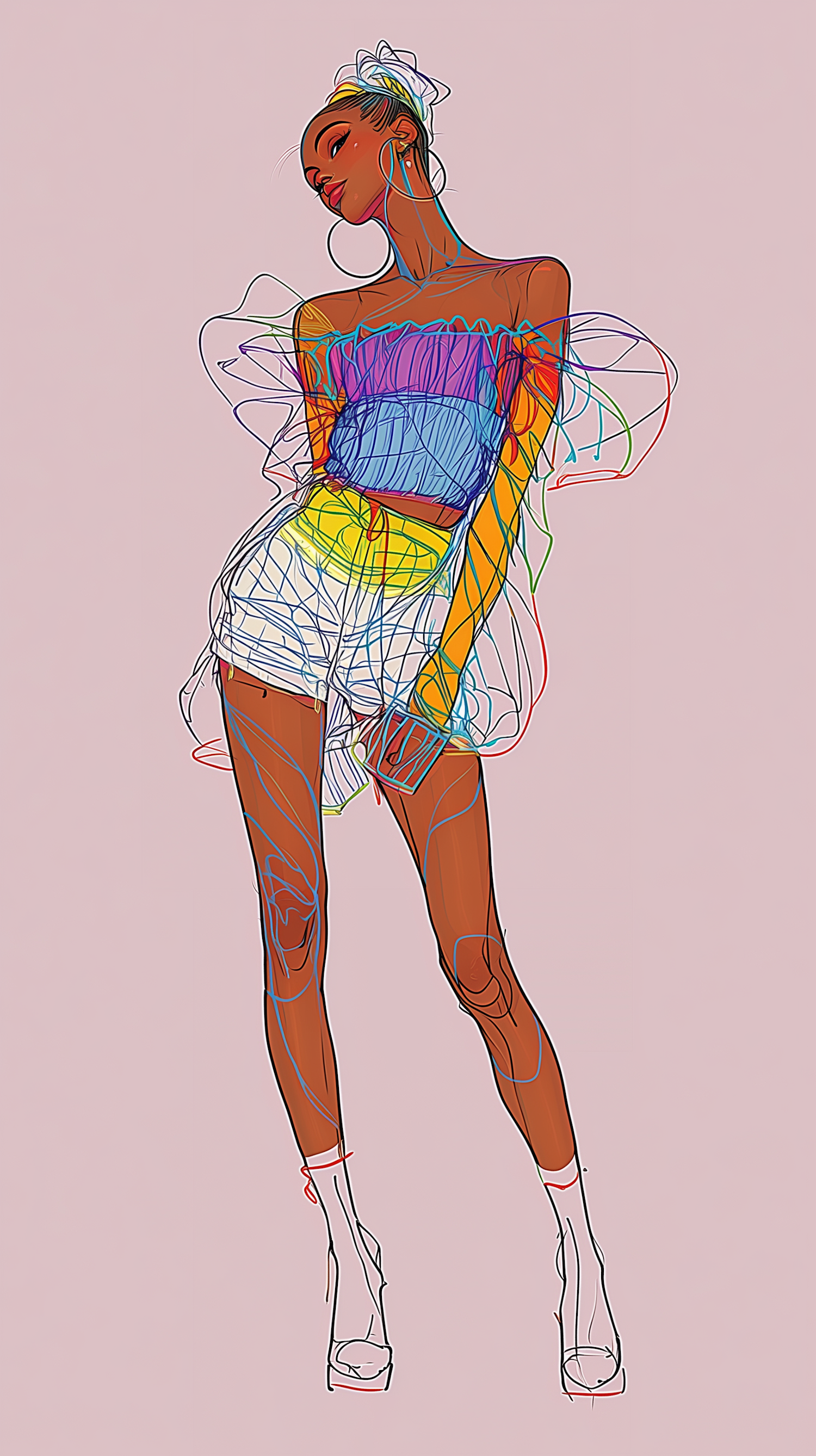 Stylish illustration of a person in colorful attire, featuring dynamic lines and vibrant colors on a pastel pink background.