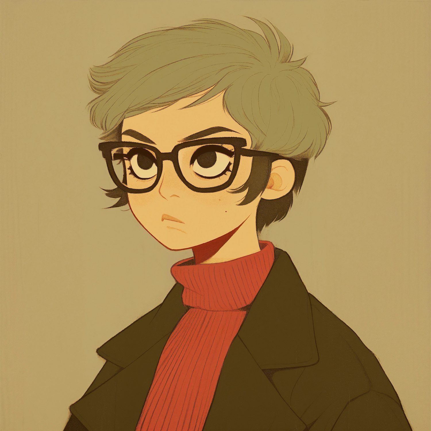 Stylized illustration of a person with glasses, short hair, and a red turtleneck, set against a beige background.