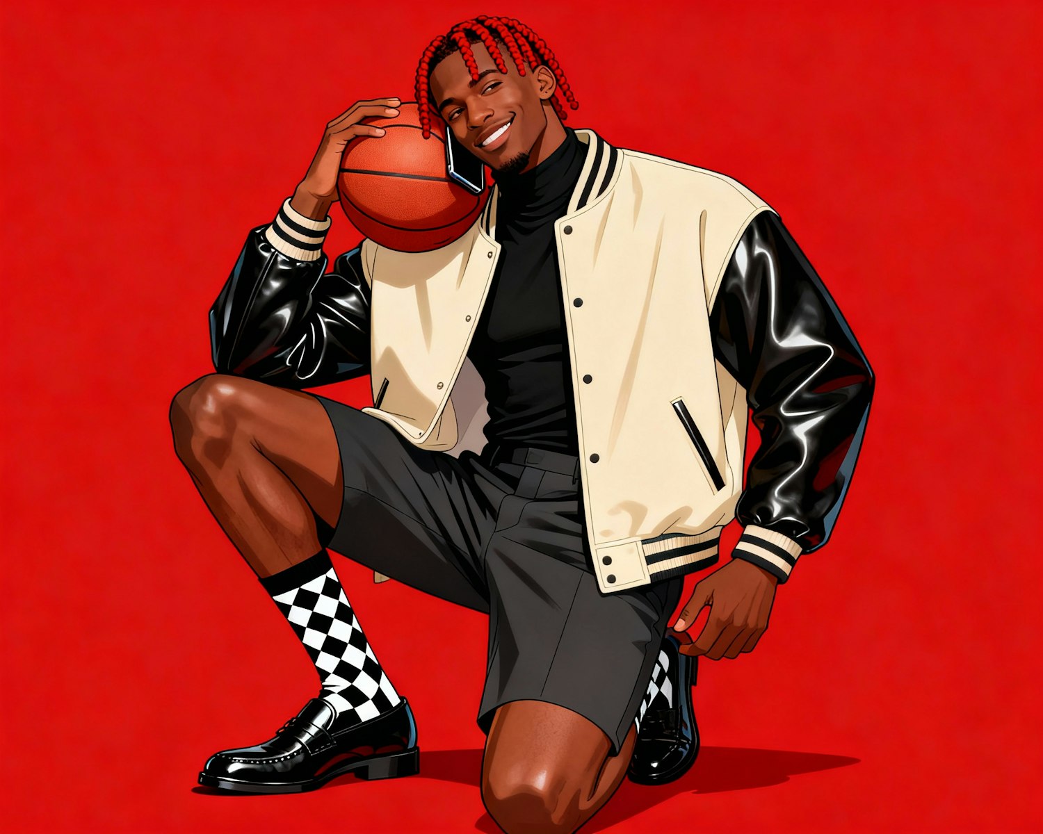 Stylish illustration of a person with red braids, varsity jacket, and basketball, set against a bold red background.