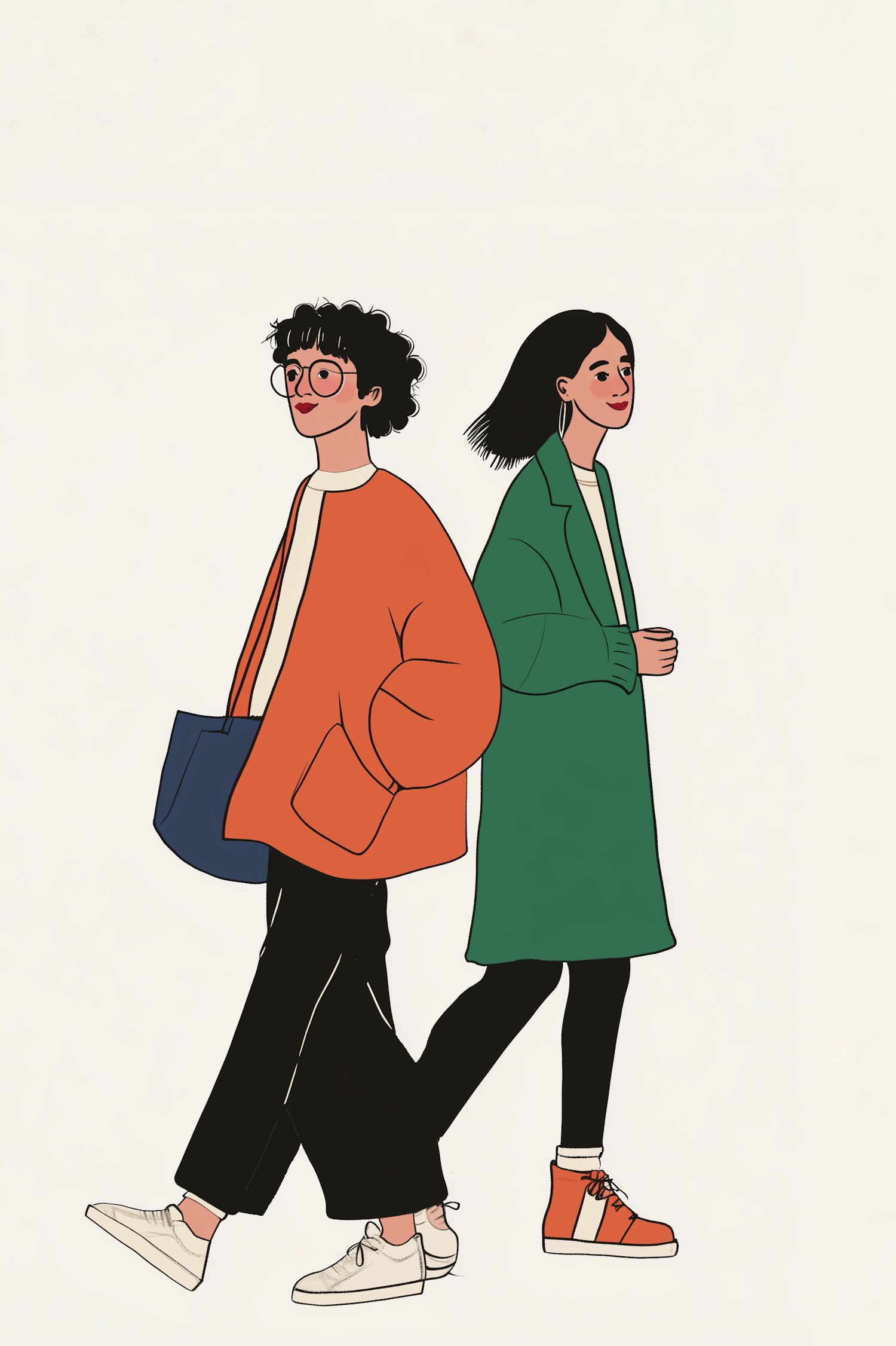Minimalist illustration of two stylish individuals walking, wearing vibrant orange and green coats with casual sneakers.