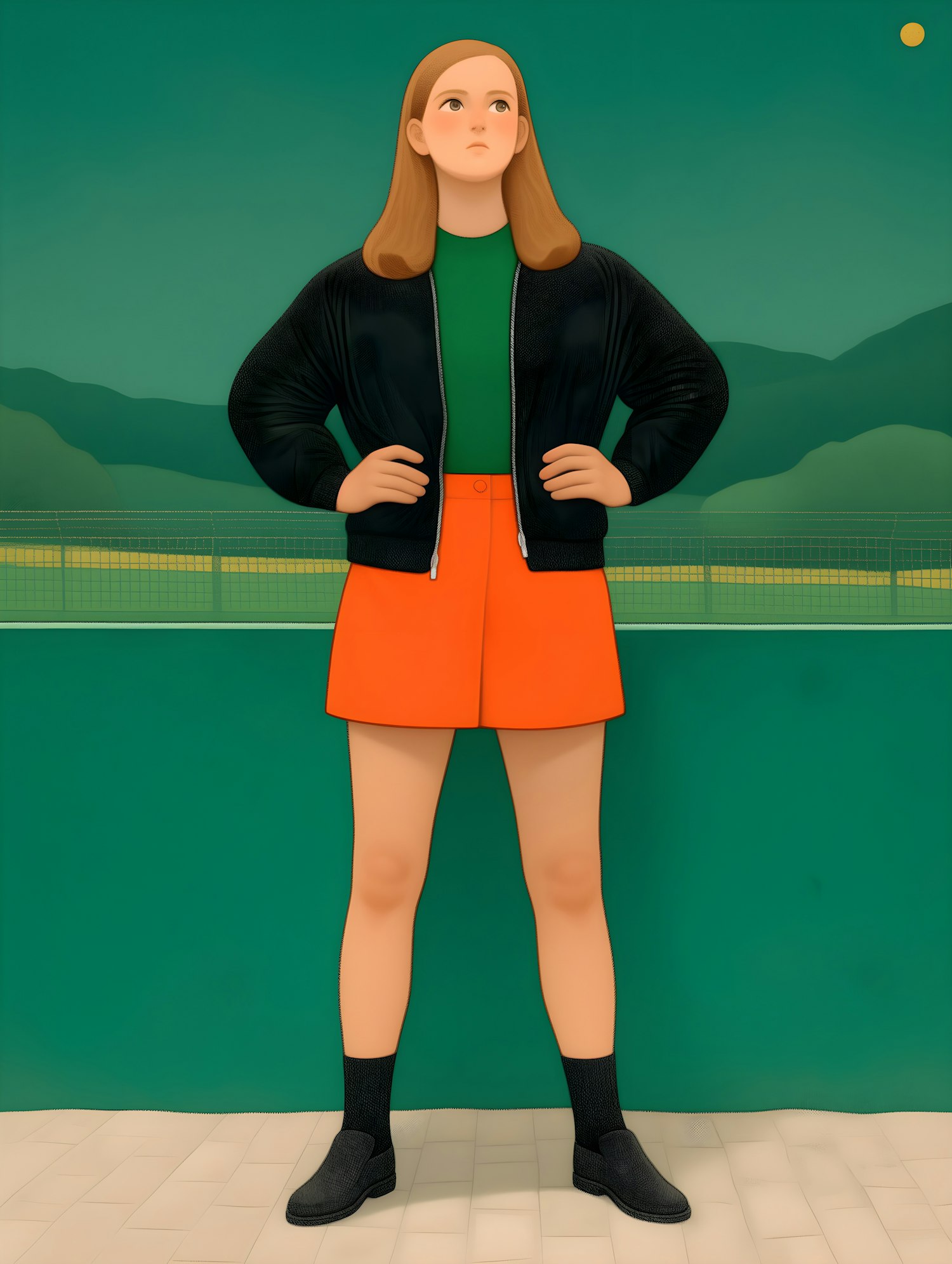 Stylish illustration of a confident figure in a black jacket, green top, and orange shorts, standing amidst a serene green landscape.