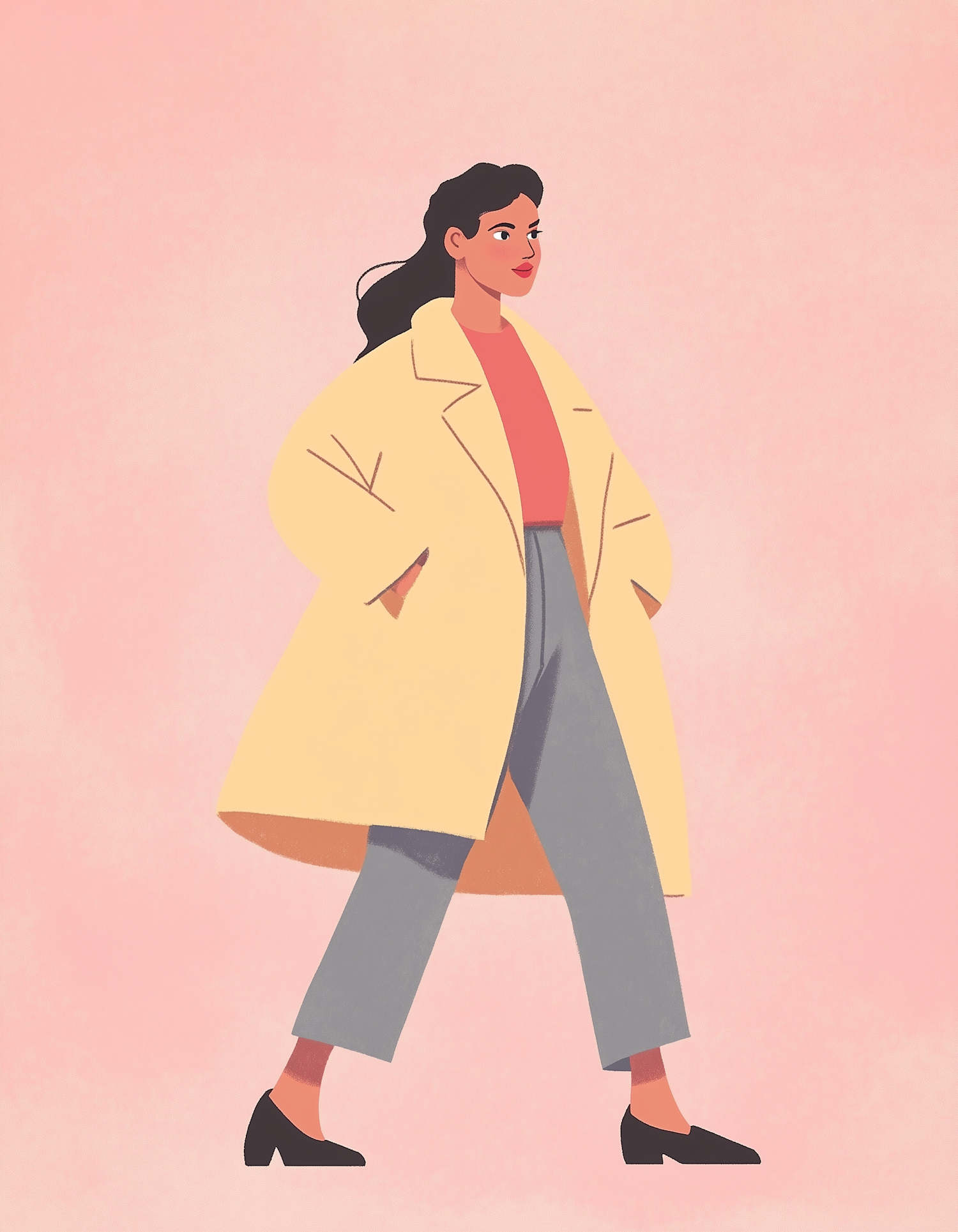 Illustration of a woman in a yellow coat and gray pants walking confidently on a pink background.