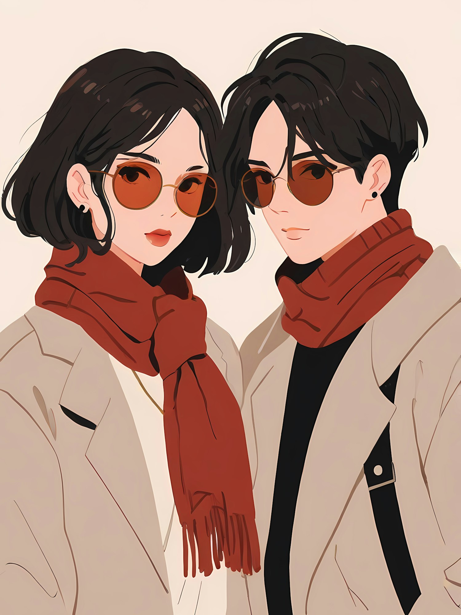 Stylish illustration of a couple in beige coats and red scarves, wearing sunglasses. Modern and chic fashion vibe.