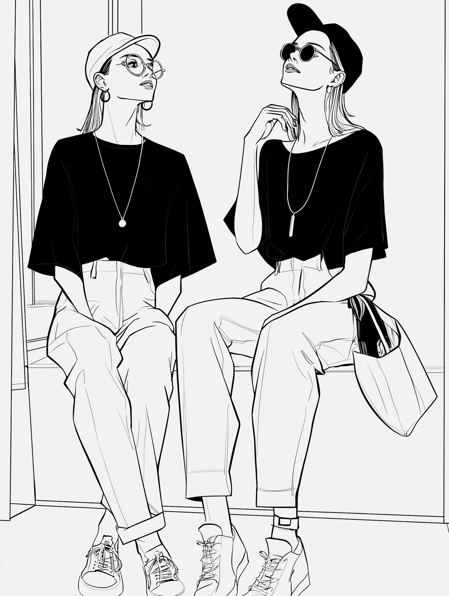 Stylish women in casual outfits with caps and sunglasses, seated side by side in a monochrome illustration.