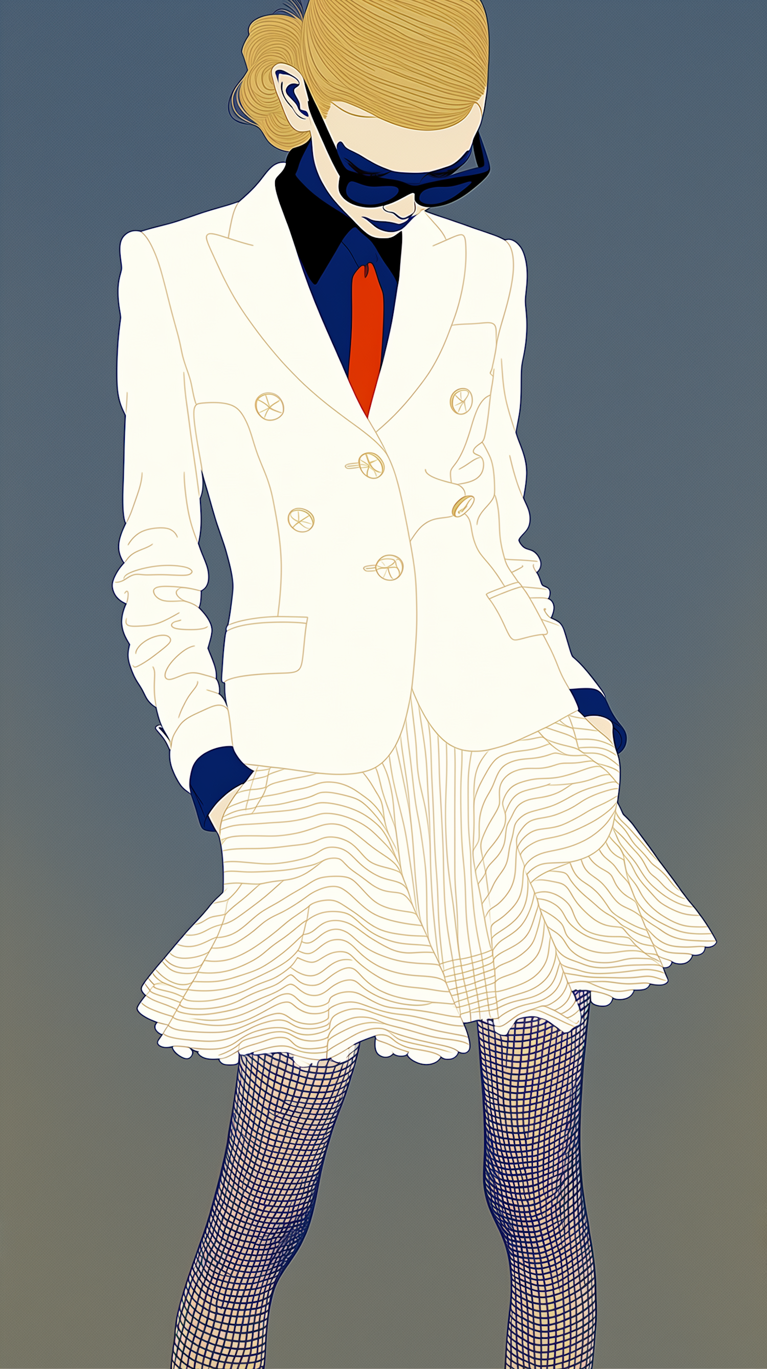 Stylized illustration of a person in a white blazer, red tie, pleated skirt, and fishnet stockings, set against a muted blue background.