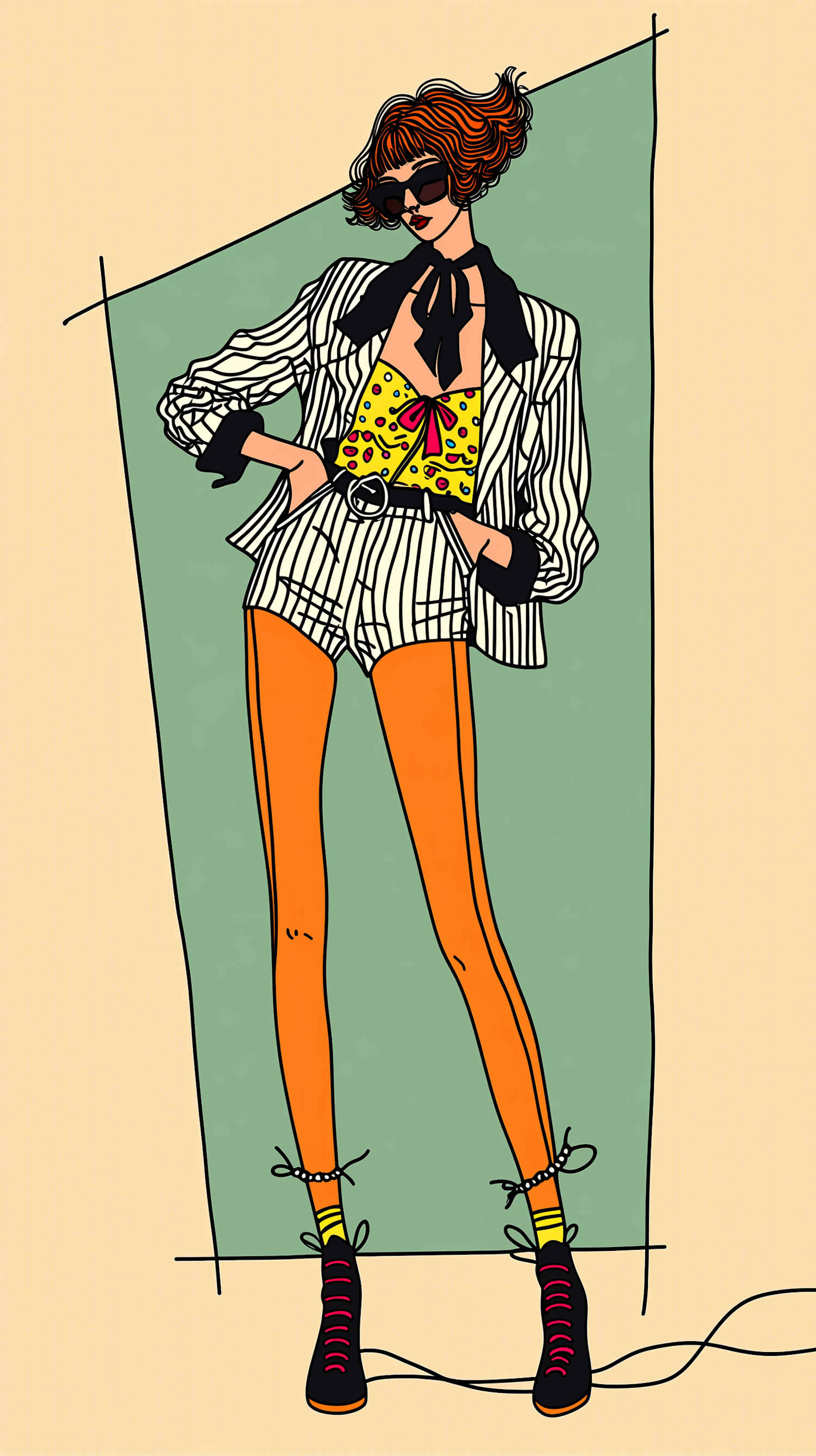 Stylized illustration of a fashionable figure in a bold outfit with orange tights, striped blazer, and sunglasses, set against a geometric background.