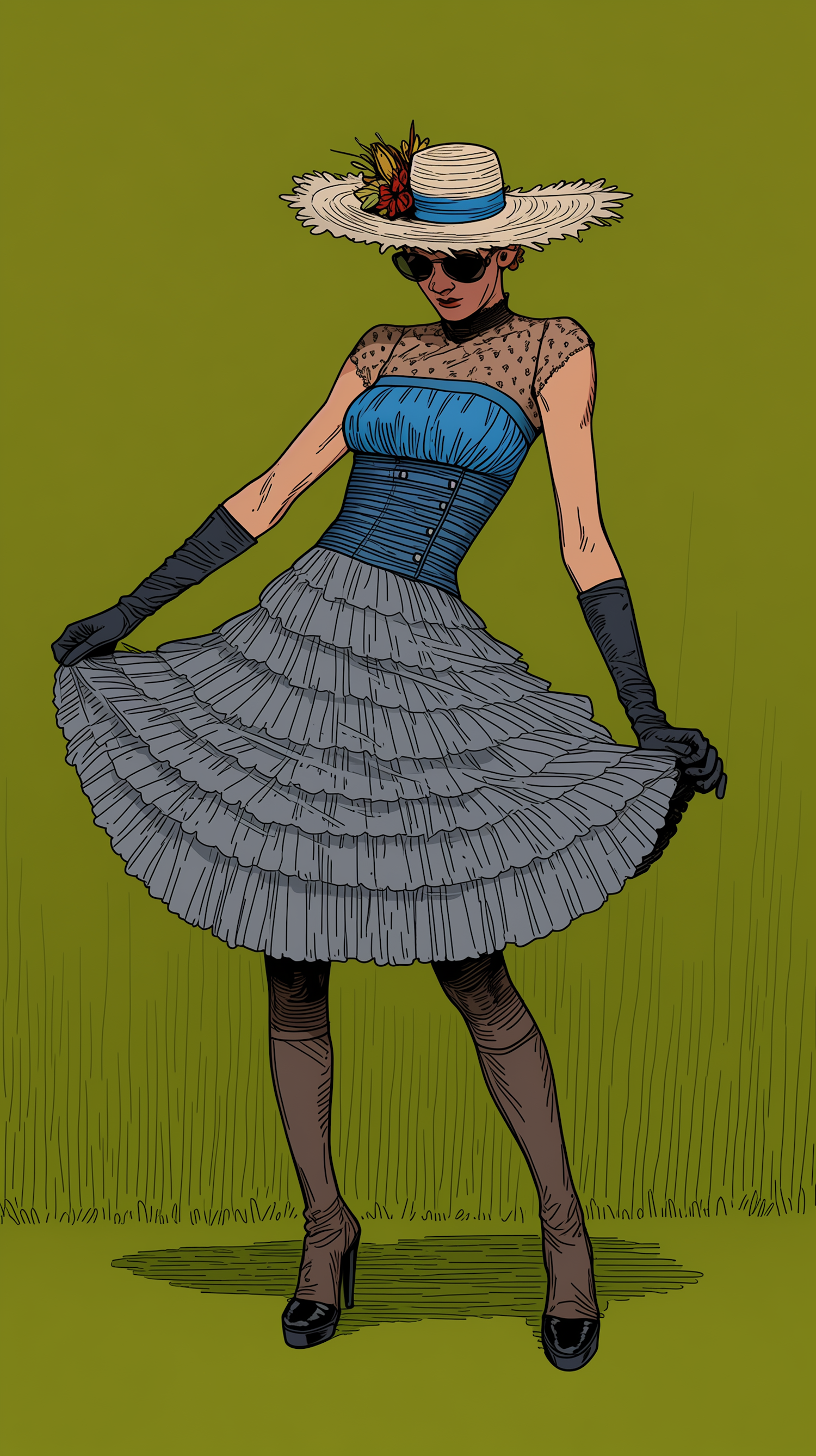 Illustration of a fashionable person in a layered skirt, corset top, and a flower-adorned hat, set against a green background.