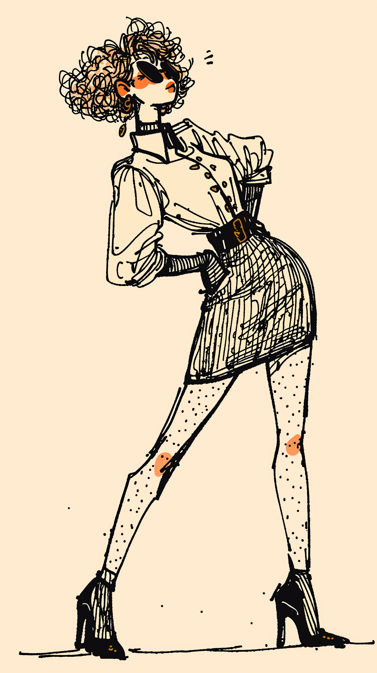 Stylized illustration of a fashionable figure in a dynamic pose, wearing a chic outfit with bold accessories and a warm color palette.