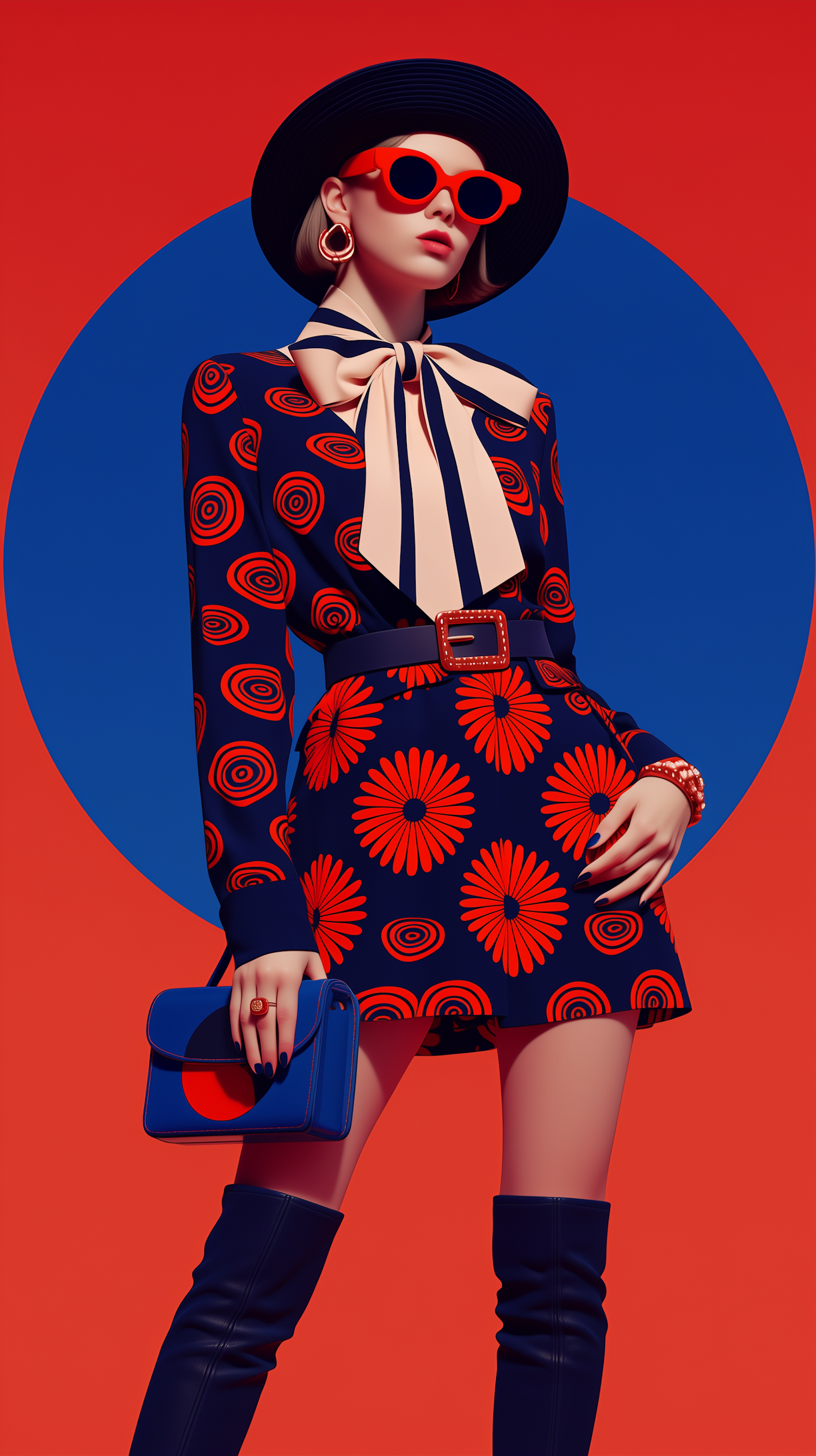 A bold fashion look with a patterned dress, red sunglasses, and a blue handbag against a vibrant red and blue background.