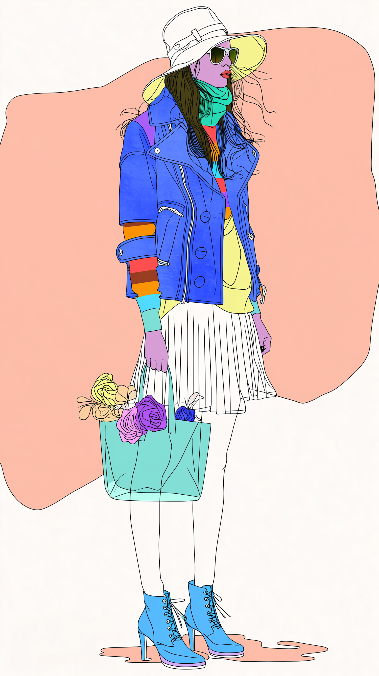 Stylish illustration of a person in a blue jacket, white skirt, and blue boots, holding a flower-filled bag against a peach abstract background.