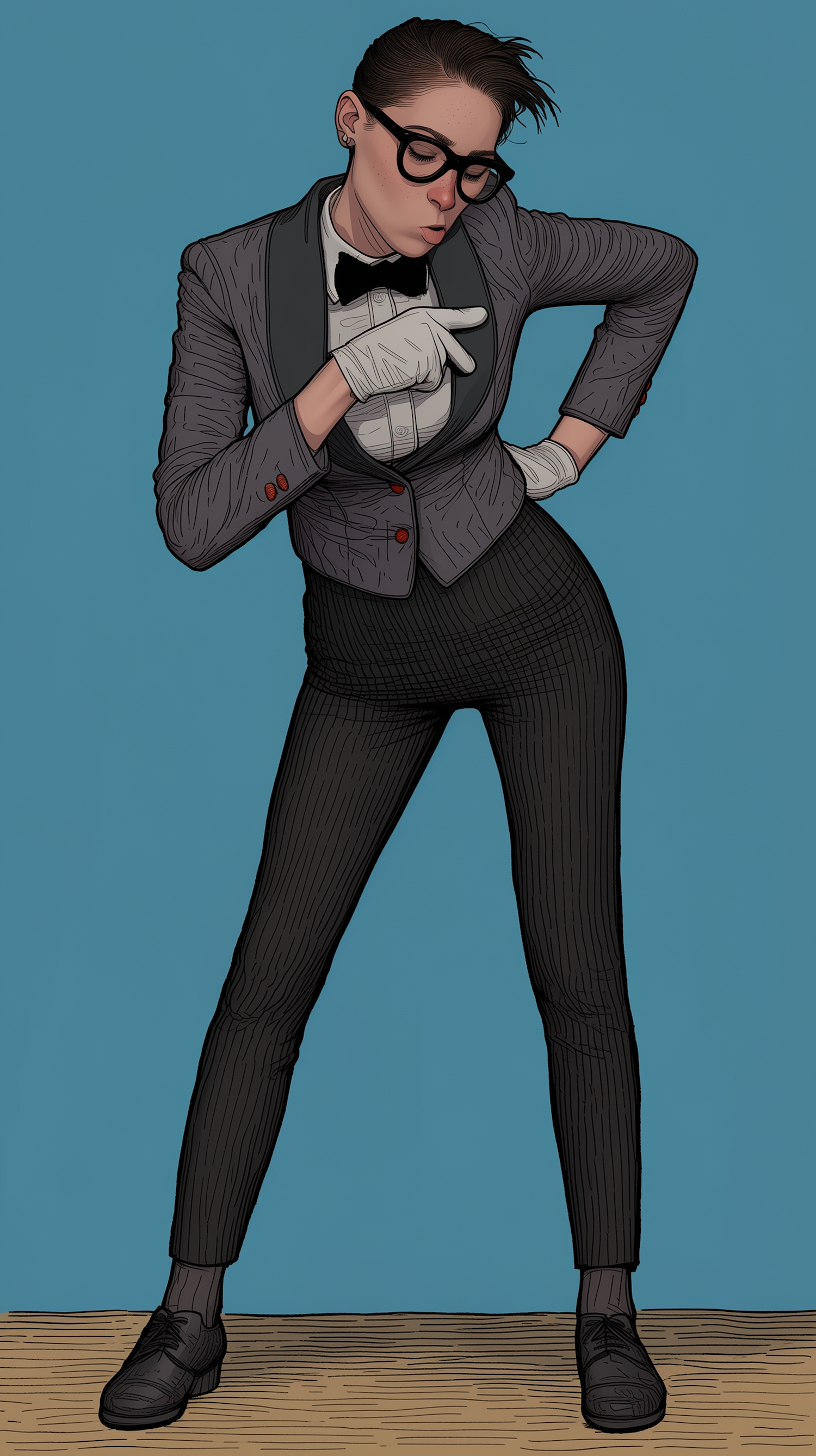 Stylish individual in formal attire striking a dynamic pose against a blue background.