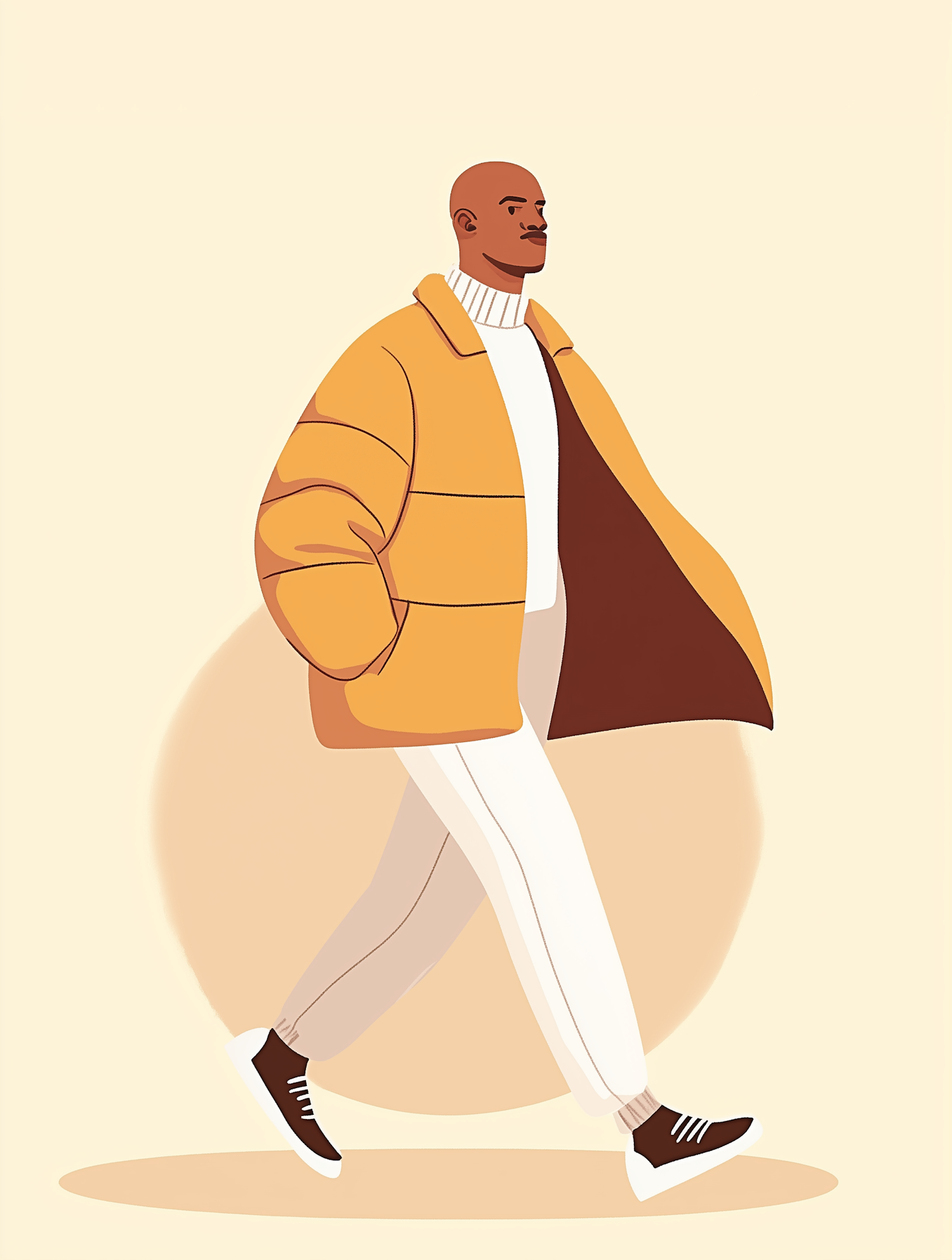Illustration of a stylish man in a mustard puffer jacket and sneakers, walking confidently against a minimalist beige background.