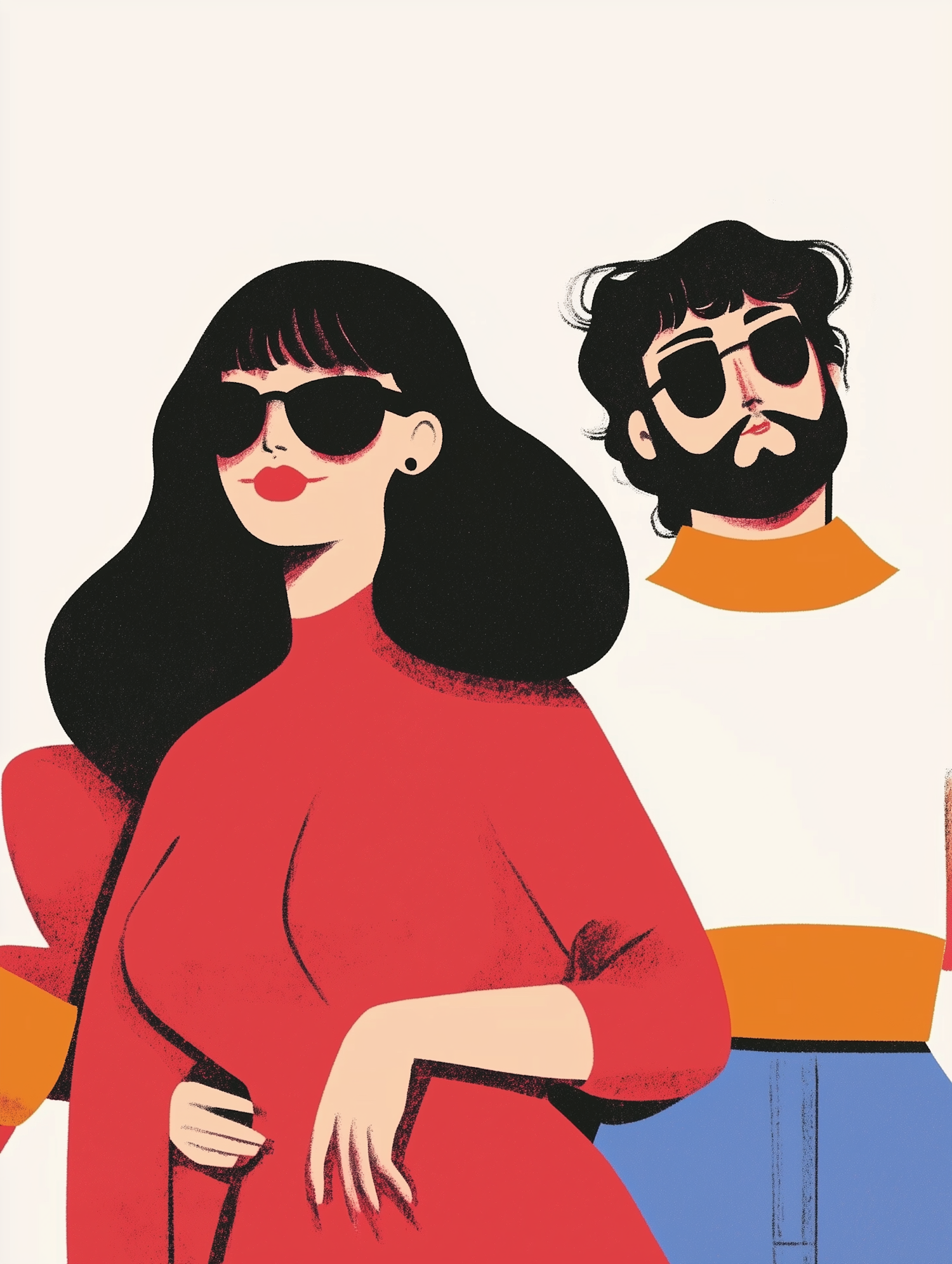 Stylized illustration of a woman in a red dress and a man in sunglasses, both exuding confidence and style.