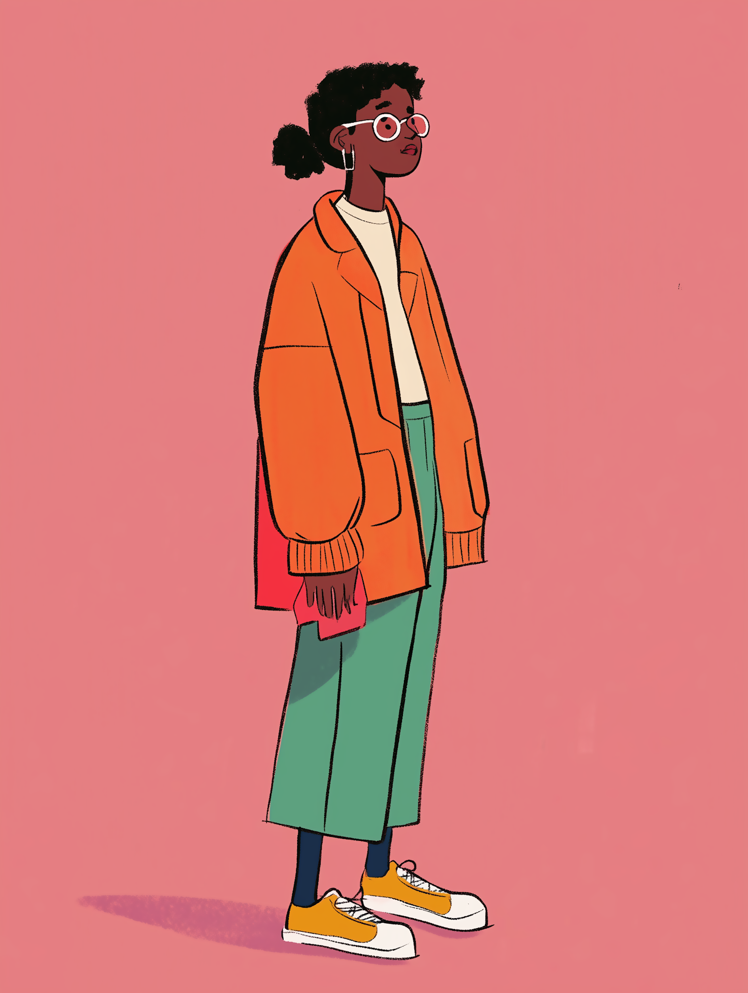 Stylized illustration of a young woman in an oversized orange coat, green trousers, and orange sneakers against a pink background.