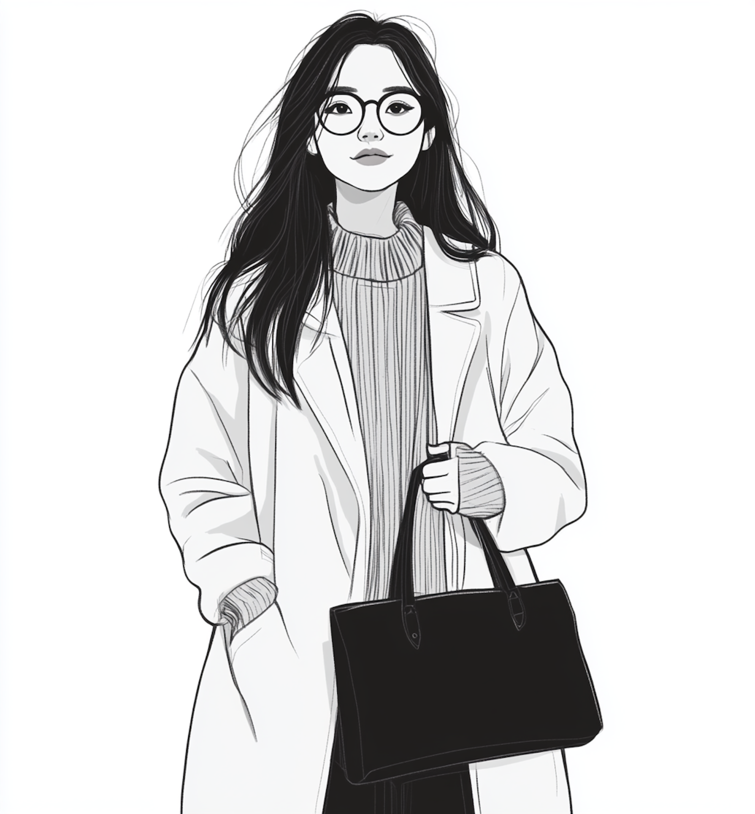 Chic illustration of a stylish woman in a coat with glasses and a handbag, exuding modern elegance in monochrome.