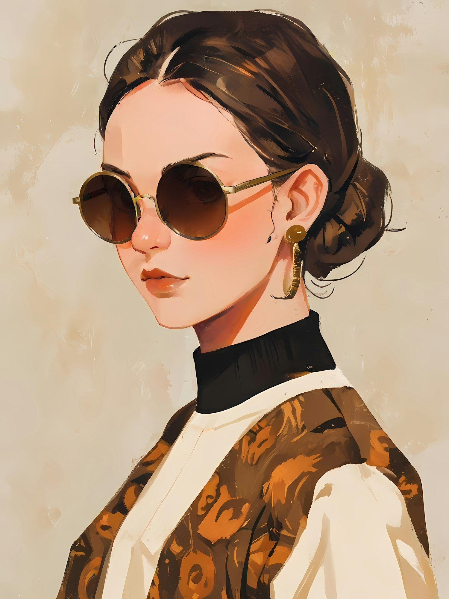 Stylish illustrated portrait featuring a person in sunglasses and a brown patterned coat on a minimal beige background.