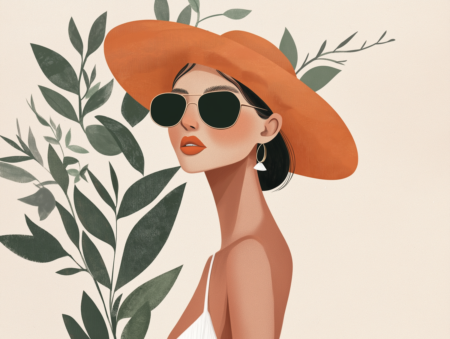 Stylish illustration of a woman in an orange sun hat and sunglasses, set against a leafy backdrop. Warm, earthy tones dominate the scene.